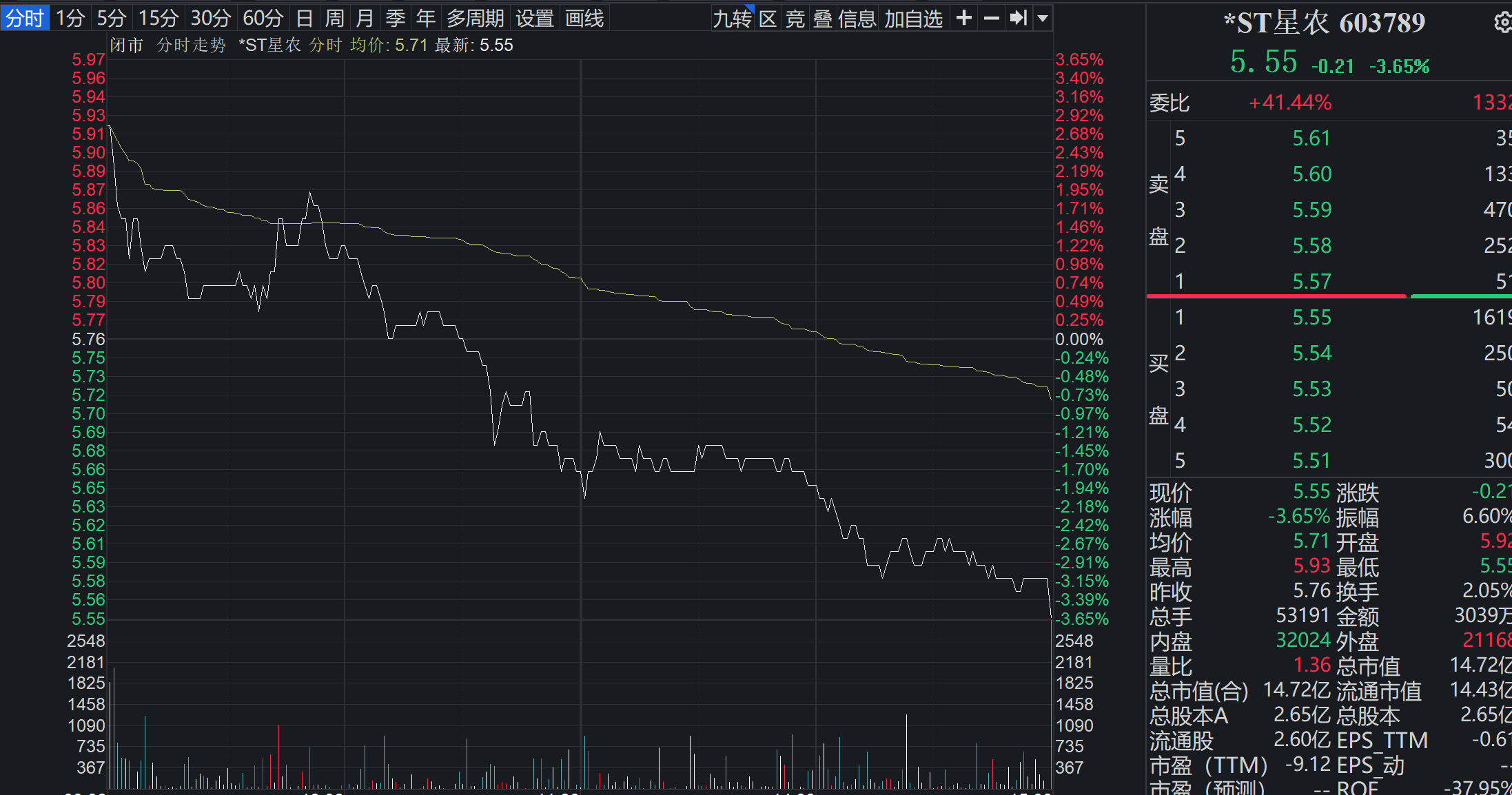 2025年4月30日,*ST星农披露,《关于实施退市风险警示暨停牌的公告》,因公司2024年度经审计的扣除非经常性损益前后的净利润低者为负值,且扣除与主营业务无关的业务收入和不具备商业实质的收入后的营业收入低于3亿元,公司股票于2025年5月6日起被实施退市风险警示。若公司2025年年度报告出现《上海证券交易所股票上市规则》第9.3.7条规定的情形,公司股票可能被上海证券交易所终止上市,敬请广大投资者注意投资风险。