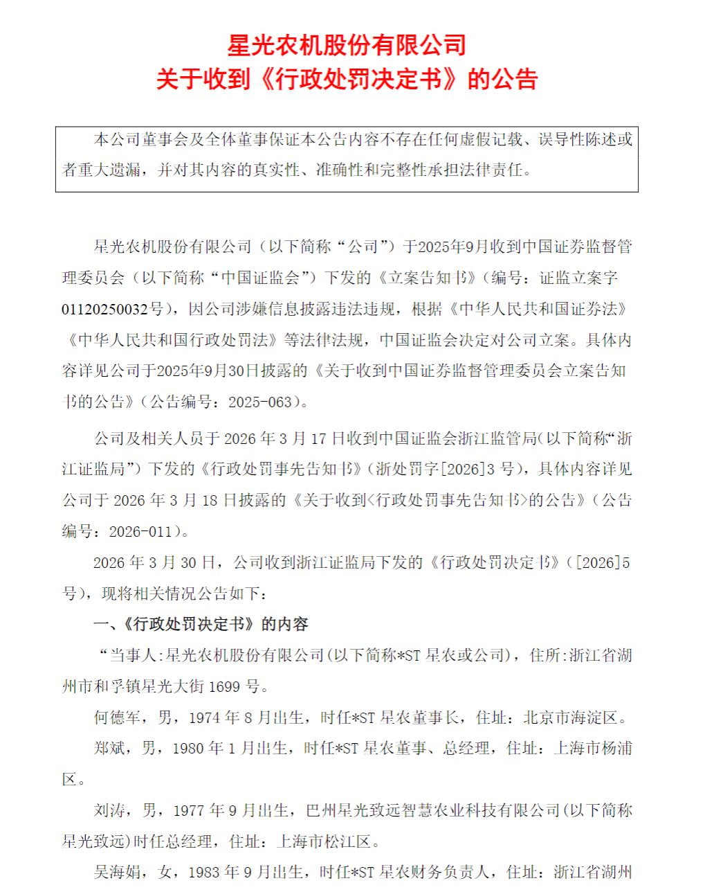 3月30日,上海证券交易所发布《关于对星光农机股份有限公司及有关责任人予以公开谴责的决定》,对该公司及时任董事长何德军,时任董事、总经理郑斌,时任财务负责人吴海娟,星光致远时任总经理刘涛予以公开谴责。