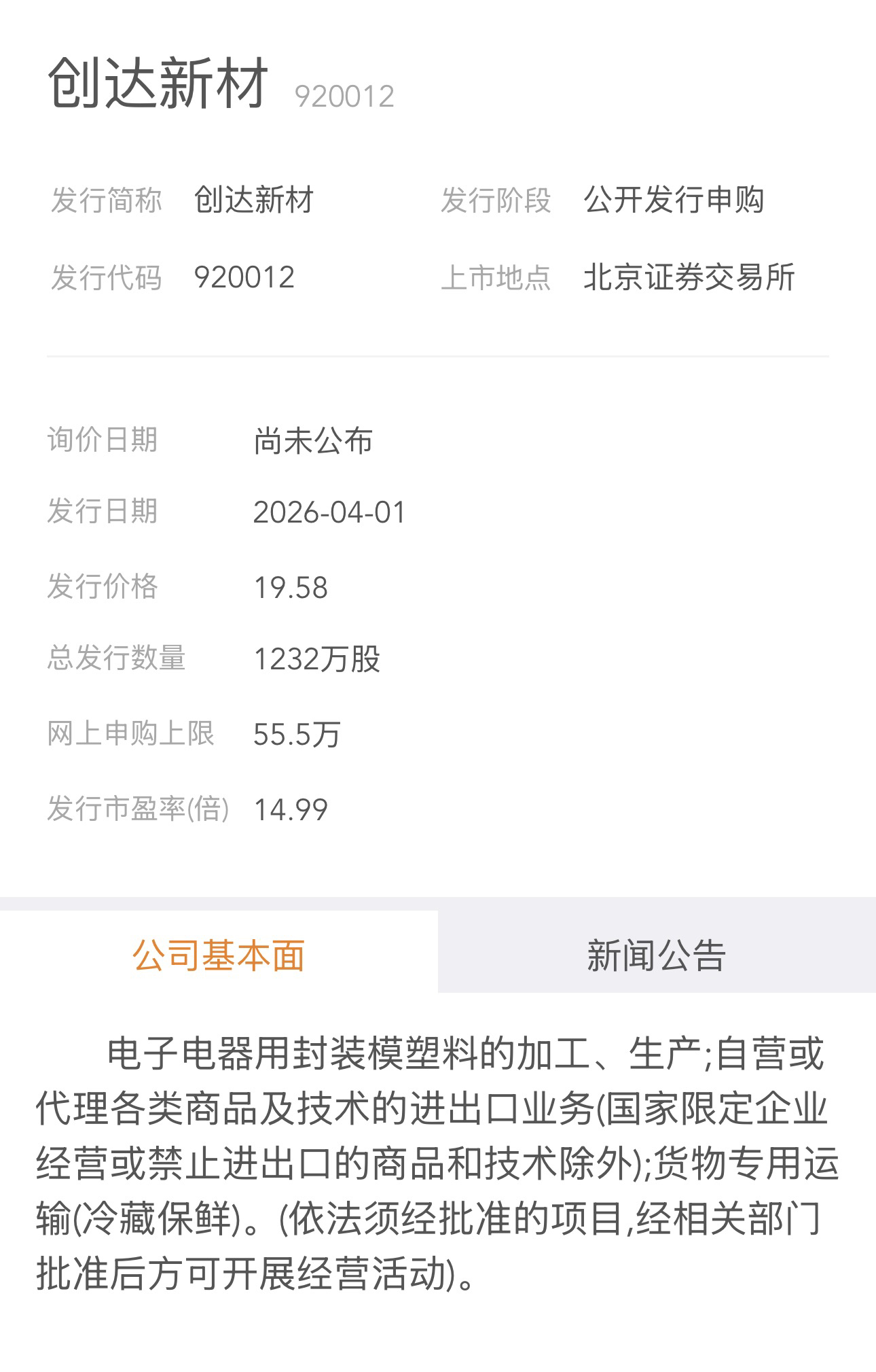 今天有一只新股申购。