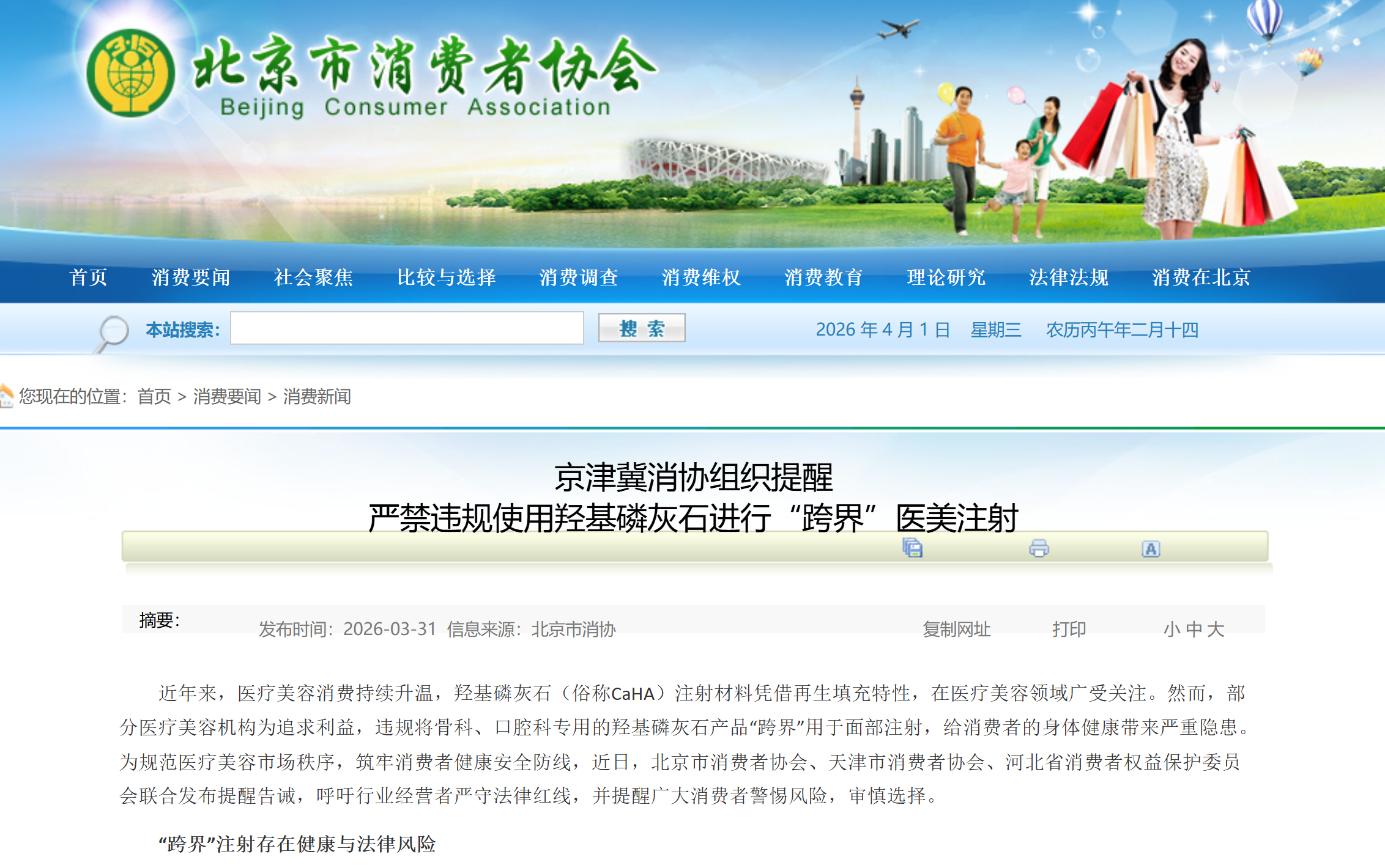 羟基磷灰石(俗称CaHA)注射材料凭借再生填充特性,在医疗美容领域广受关注。然而,部分医疗美容机构为追求利益,违规将骨科、口腔科专用的羟基磷灰石产品“跨界”用于面部注射,给消费者的身体健康带来严重隐患。近日,北京市消费者协会、天津市消费者协会、河北省消费者权益保护委员会联合发布提醒告诫,呼吁行业经营者严守法律红线,并提醒广大消费者警惕风险,审慎选择。