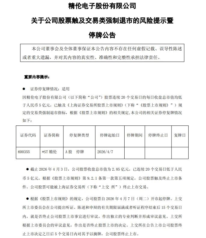 扬子晚报网4月4日讯(记者 范晓林 薄云峰)*ST精伦4月3日晚间公告称,公司股票4月3日收盘总市值为2.85亿元,自3月9日至4月3日已连续20个交易日收盘总市值低于5亿元,已触及《股票上市规则》规定的交易类强制退市情形。同日,公司公告,收到上交所下发的终止上市监管工作函。