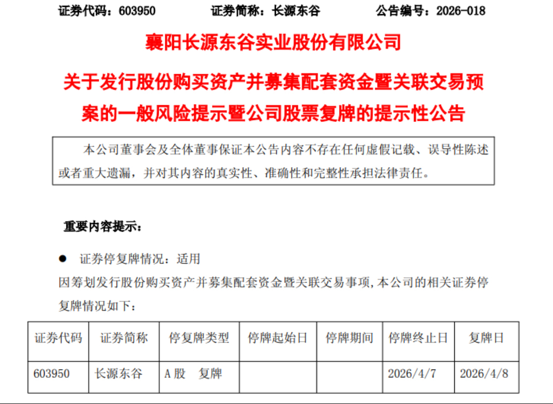 扬子晚报网4月8日讯(记者 范晓林 薄云峰)长源东谷4月7日公告,公司拟通过发行股份的方式向交易对方购买其持有的康豪机电100%股权,并向不超过35名特定投资者发行股份募集配套资金。根据相关规定,长源东谷股票于4月8日开市起复牌。