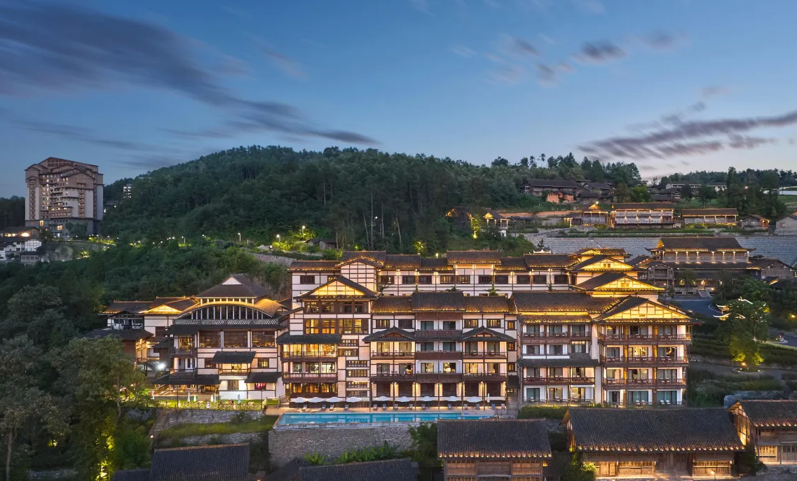 在贵州遵义,今年新上榜的乌江寨苗王酒店就是一个典型。坐落于乌江寨国际旅游度假区制高点,99间客房均配备落地窗与独立观景阳台,推窗即见峡谷晨雾、俯首可览乌江蜿蜒;景区唯一全景观景餐厅,让早餐也成为一场景观体验。酒店以苗族文化深度沉浸为核心——大堂太阳鼓图腾、入住即可免穿苗服,46项特色文旅体验触手可及。