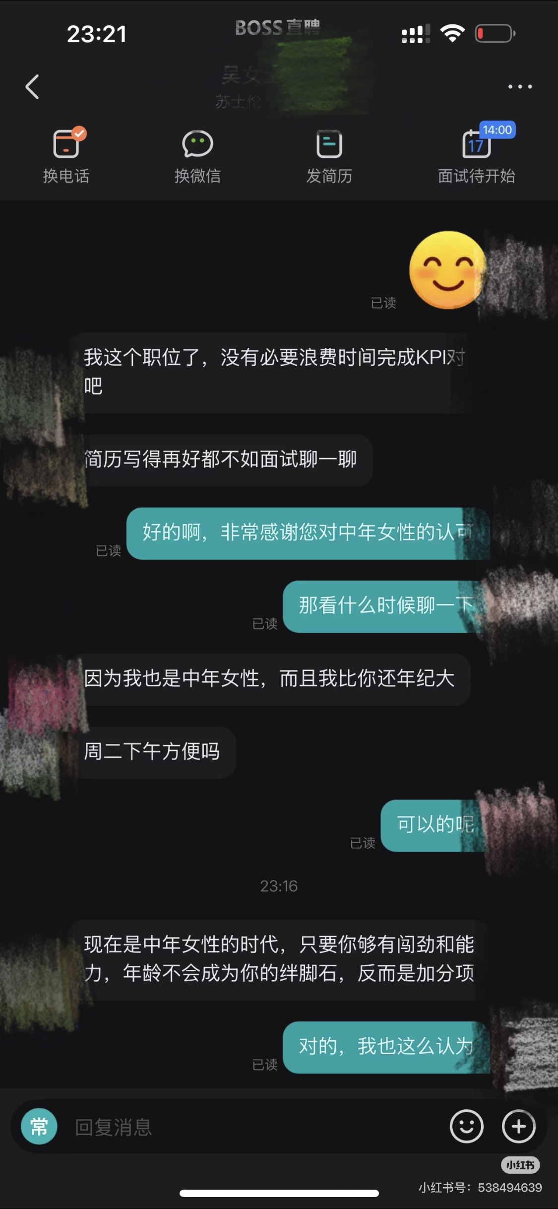 另一位网友回忆:“我也35+,去年失业。虽然还没找到工作,但在BOSS上遇到的HR都挺好的。有一次面试没通过,HR还鼓励我别灰心,我现在还记着。”