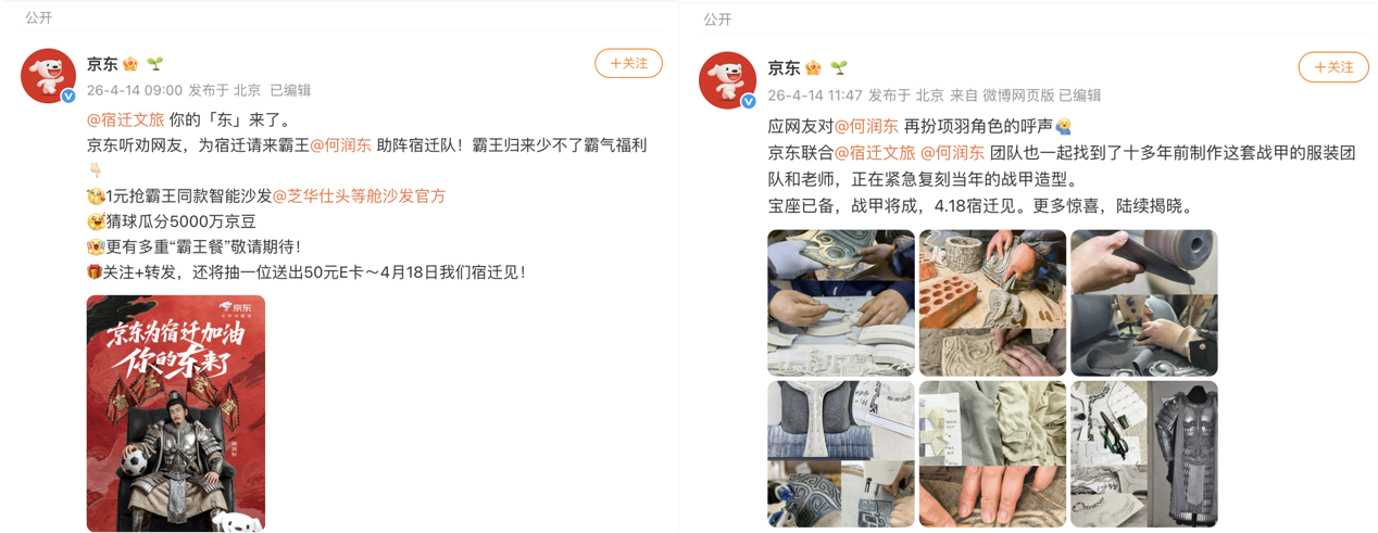 近日,因在经典剧集《楚汉传奇》中成功塑造“西楚霸王”项羽一角而再度火爆出圈的著名演员何润东,引发网友集体回忆杀。大量网友自发喊话“请霸王回家”,希望他为正在火热进行的“苏超”联赛助阵。面对这波热情高涨的呼声,一向“听劝”的京东迅速响应,直接为宿迁请来了何润东,携手宿迁文旅共同向他发出正式邀请,并官宣他将于4月18日以项羽经典造型空降宿迁奥体中心,为“霸王故里”宿迁队加油打气。针对网友“想看何润东穿项羽服装上场”的留言,京东方面透露,“霸王铠甲”已在加急制作中,还准备了“霸王宝座”静候霸王归位,力求以最还原、最震撼的方式,让“西楚霸王”真正回乡助威。