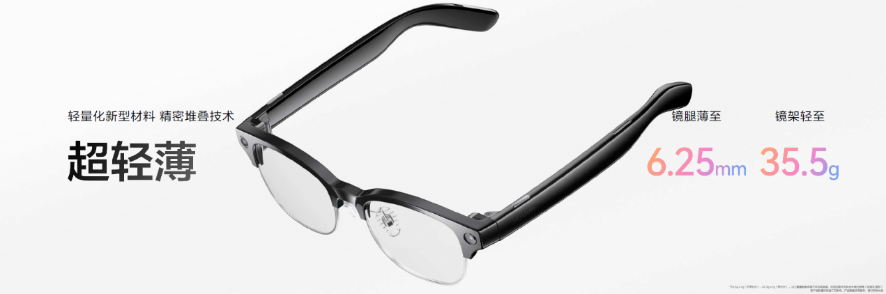 华为 AI 眼镜采用轻量化材质与精密堆叠工艺,整机重量仅 35.5 克,镜腿薄至 6.25 毫米,引领AI眼镜超轻设计。产品基于对亚洲30万+头型特征数据的分析,构建了“黄金三角平衡架构”,实现均衡配重。并且搭配钛合金恒力铰链与三面环抱式设计,佩戴更加稳固贴合,可满足全天候舒适佩戴需求。