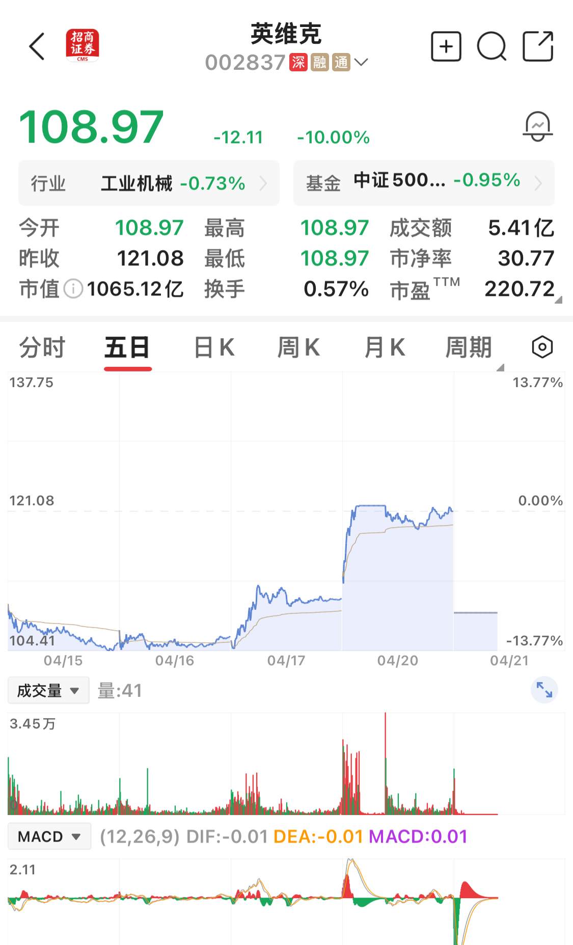 扬子晚报网4月21日讯(记者 范晓林 薄云峰)昨天盘中涨停,创出历史新高的液冷大牛股英维克,今天早盘“一”字跌停。截至午盘,跌停板仍有逾54万手封单,最新市值为1065.1亿元。