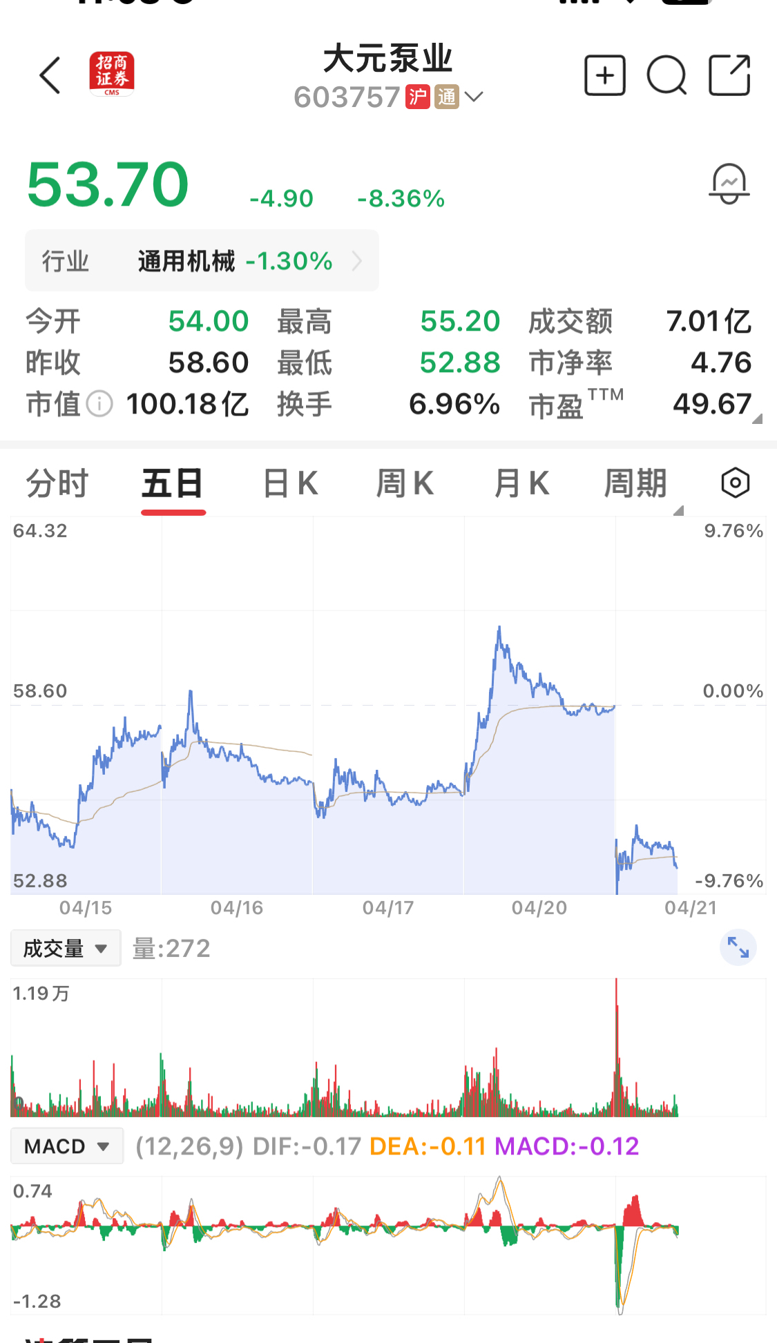 大元泵业今天早盘下跌8.36%。