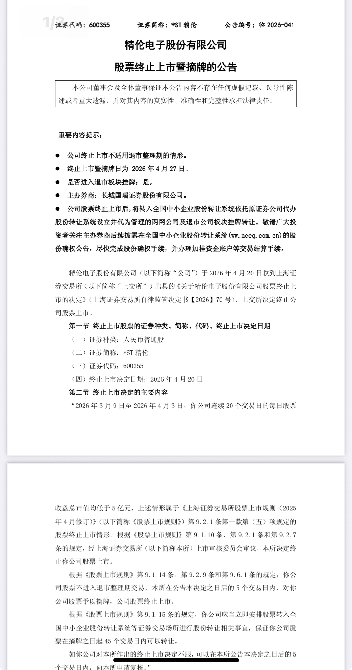 扬子晚报网4月21日讯(记者 范晓林 薄云峰)4月20日,*ST精伦收到上交所出具的决定书:上交所决定终止公司股票上市。*ST精伦股票将于2026年4月27日终止上市暨摘牌,同时交易类强制退市公司股票不进入退市整理期交易。