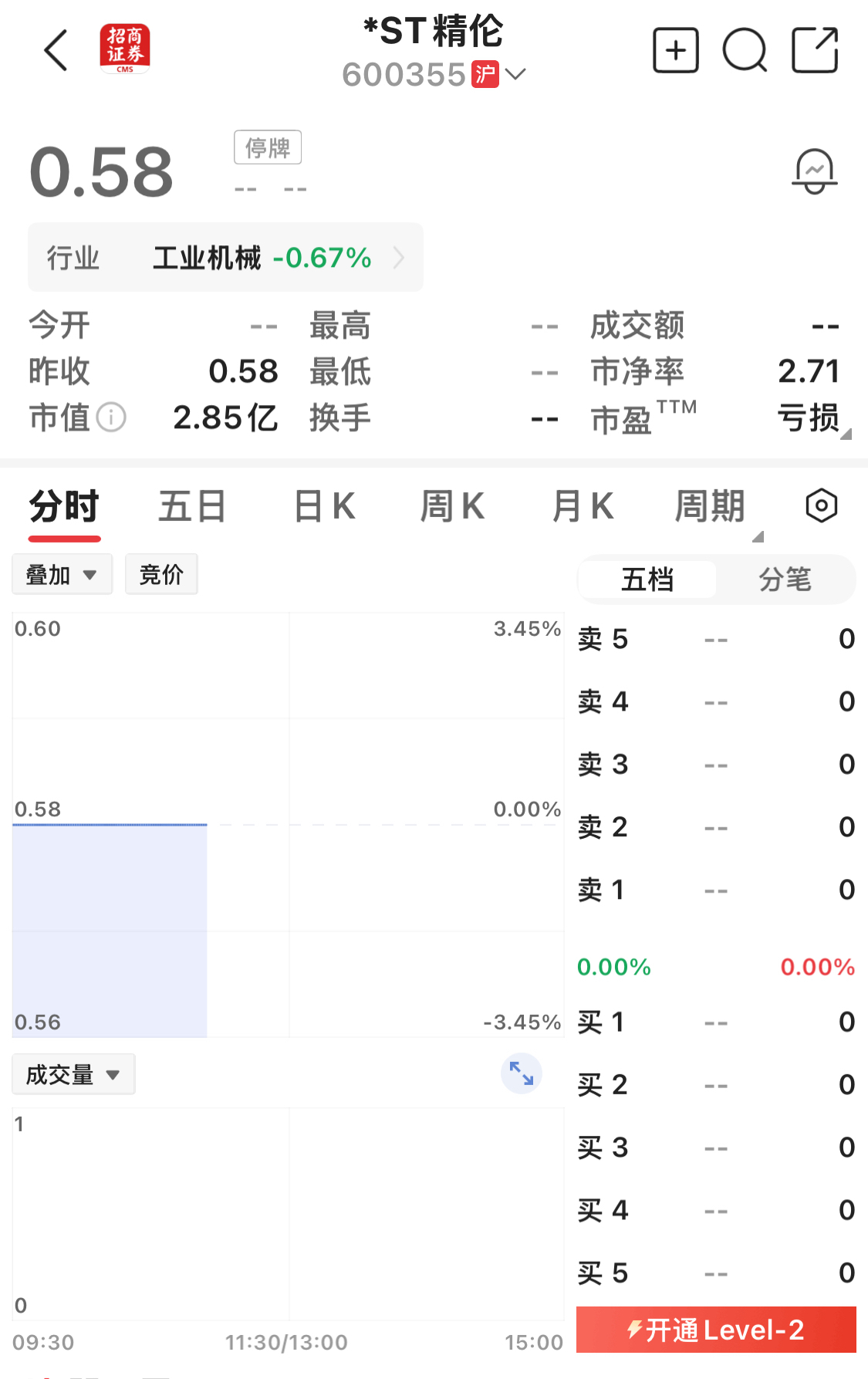 早在2002年,*ST精伦即完成上市,该公司目前的主要业务分为智能制造类、商用智能终端类以及软件与信息服务类三个种类,其中智能制造类产品以工业缝制设备数控交流伺服系统为主要业务。自1月27日起,*ST精伦股价急速下跌。在此前一日,公司总市值还超过11亿元,不过在43个交易日之后,*ST精伦股价累计下跌近75%。公司股票停牌前的最后一个交易日,*ST精伦股价报0.58元/股,总市值2.85亿元。