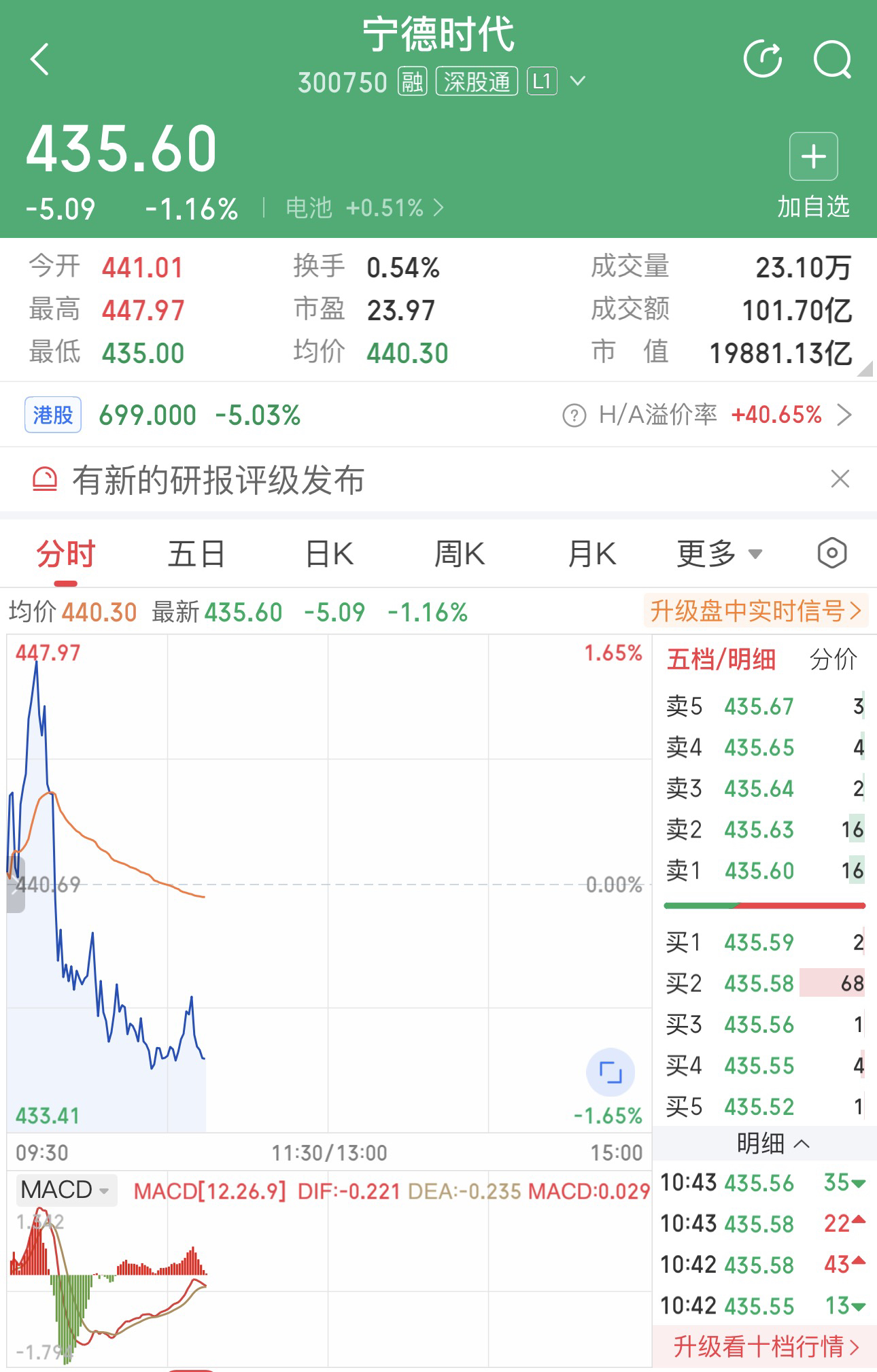 截至4月21日收盘,宁德时代最新股价为435.6元,总市值19881亿元。
