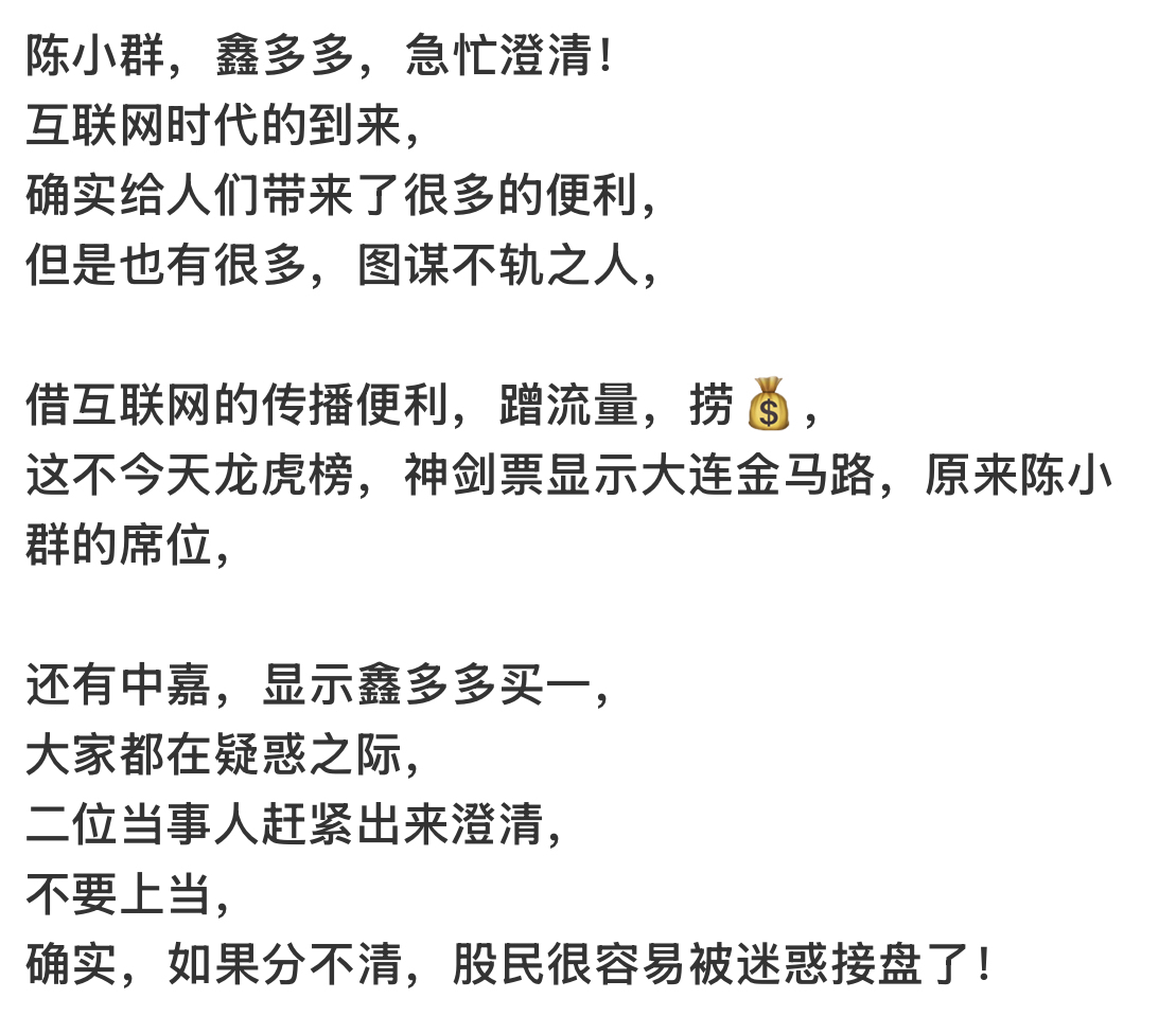 网友呼唤鑫多多出面澄清投资者相关疑问。