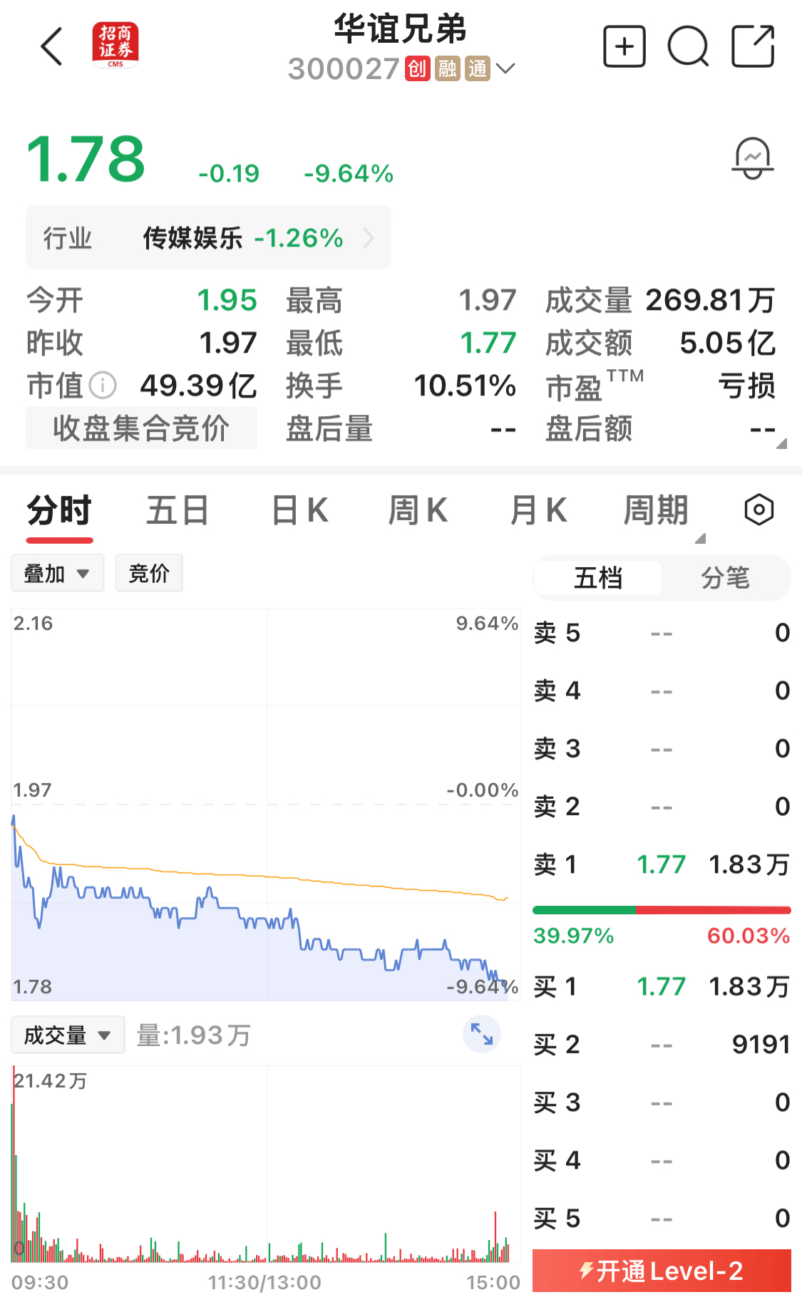 截至发稿时,华谊兄弟的股价为1.77元/股,市值为49.11亿元。相较于2015年32.13元的历史峰值,目前华谊兄弟的股价已经缩水约95%。