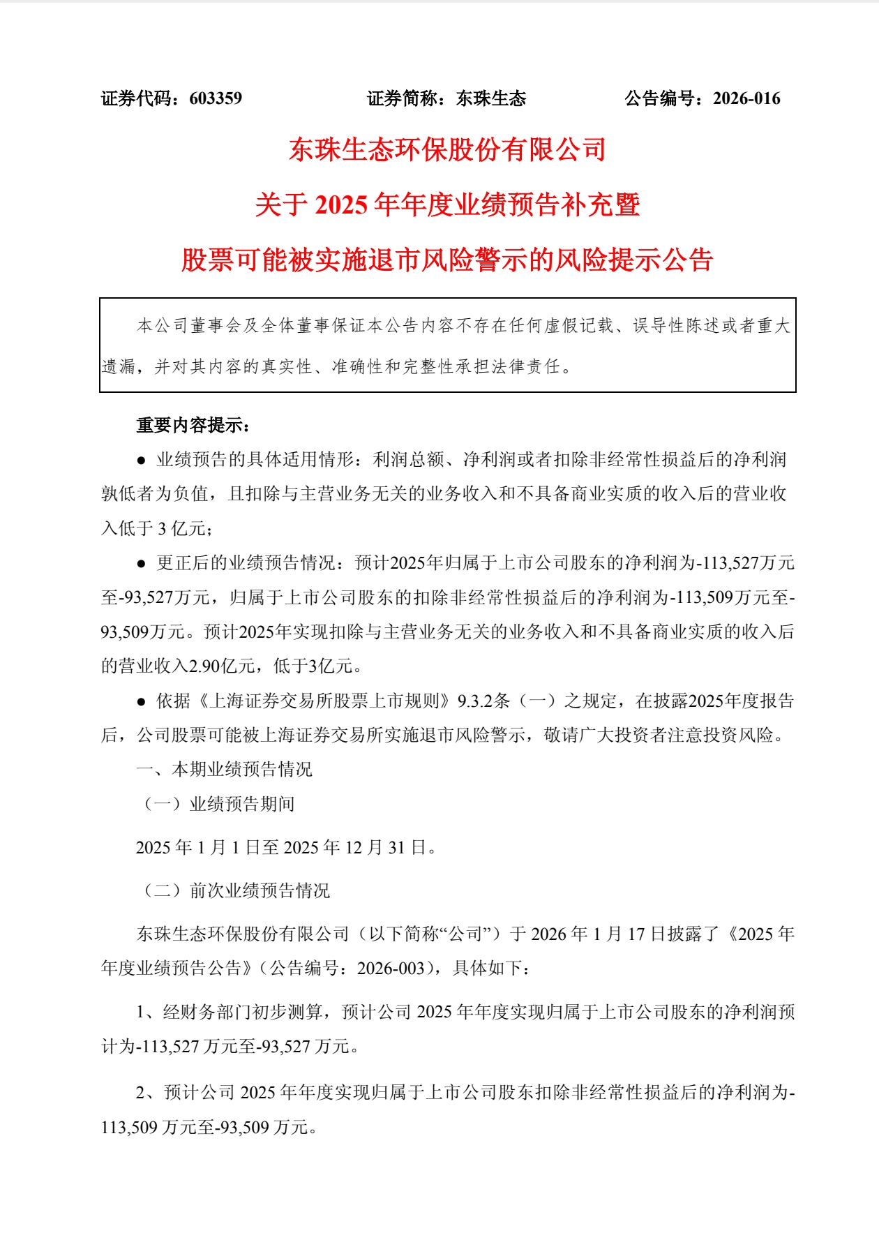 4月24日,东珠生态(603359)发布 2025 年年度业绩预告补充公告称,公司股票可能被上海交易所实施退市风险警示。上海古北律师事务所证券索赔团队负责人吴立骏律师表示,东珠生态突然公告扣非后营业收入不满3亿元将会被*ST,受损股民可加入索赔。