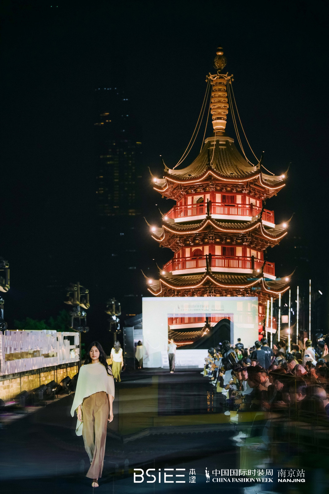 南京这座城市本身就带着一种松弛感,不急不躁。发布会当天,天气一反前几日的降温,意外地晴朗温暖,微风习习。大秀开始前,嘉宾们站在城墙上,一睹玄武湖的湖光潋滟。随着夜幕降临,湖面由金色渐变为深蓝,泛起点点光影。近处鸡鸣寺的药师佛塔灯光点亮,远处紫峰大厦的光影内透,一古一今两座地标遥相呼应,成为这场发布会最动人的天然帷幕。