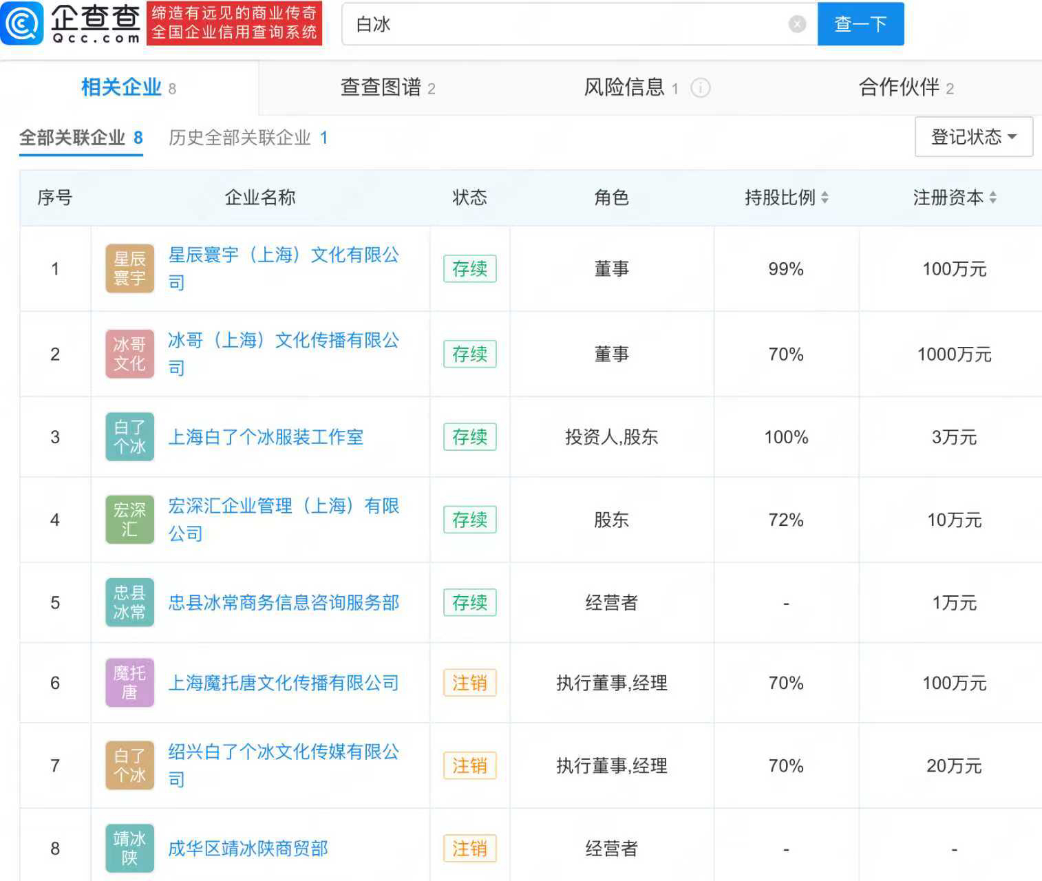企查查信息显示,白冰名下关联企业达8家,商业版图横跨文化传播、服装及企业管理。值得注意的是,就在案件查处前夕的2025年8月,白冰刚刚成立了星辰寰宇(上海)文化有限公司,由其本人持股99%并担任法定代表人,意图打造个人MCN机构。