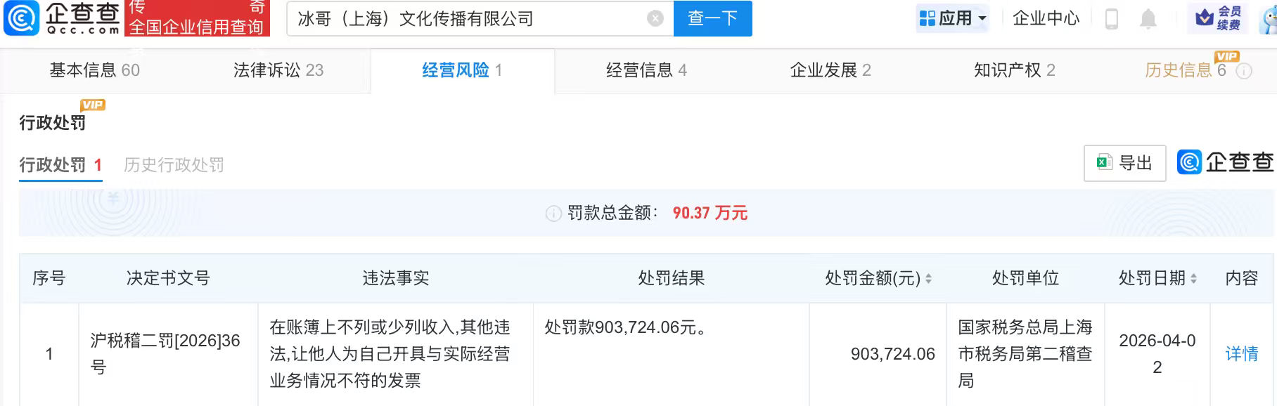 据国家税务总局通报,拥有超4000万粉丝的“探店”网红白冰在2021年至2024年期间,通过转换收入性质、虚假申报等多种手段,累计少缴个人所得税、增值税、契税等税费共计 911.18万元。税务部门依据相关法律法规,对其处以追缴税款、加收滞纳金并处罚款合计 1891.24万元 的处理处罚决定。目前,该笔款项已全数追缴入库。