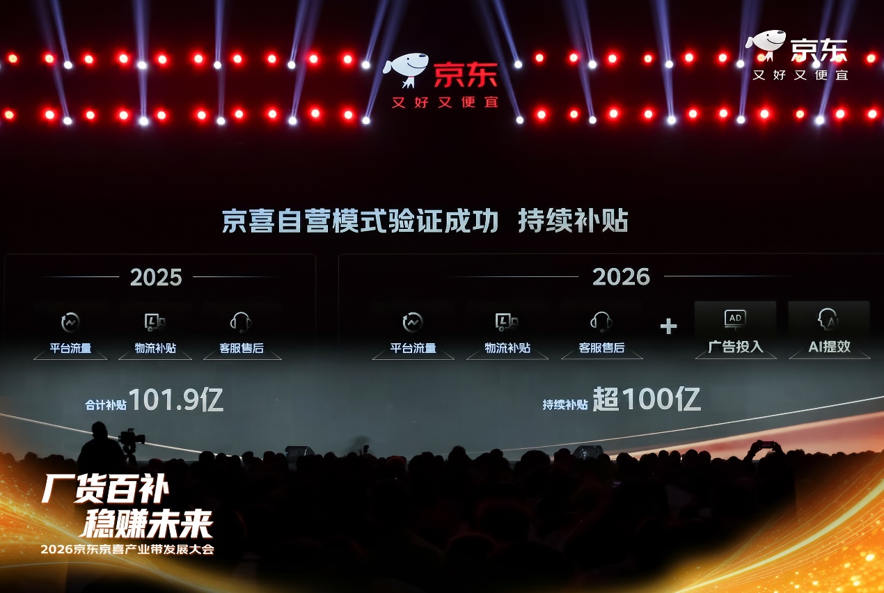2025年起,京喜自营宣布“厂货百补”计划,实际投入101.9亿元。今年,京喜将持续加码厂货补贴,将再度投入超100亿元,在平台流量、物流补贴、客服售后之外,加入广告投入及AI提效等扶持,为产业带商家注入增长动能。