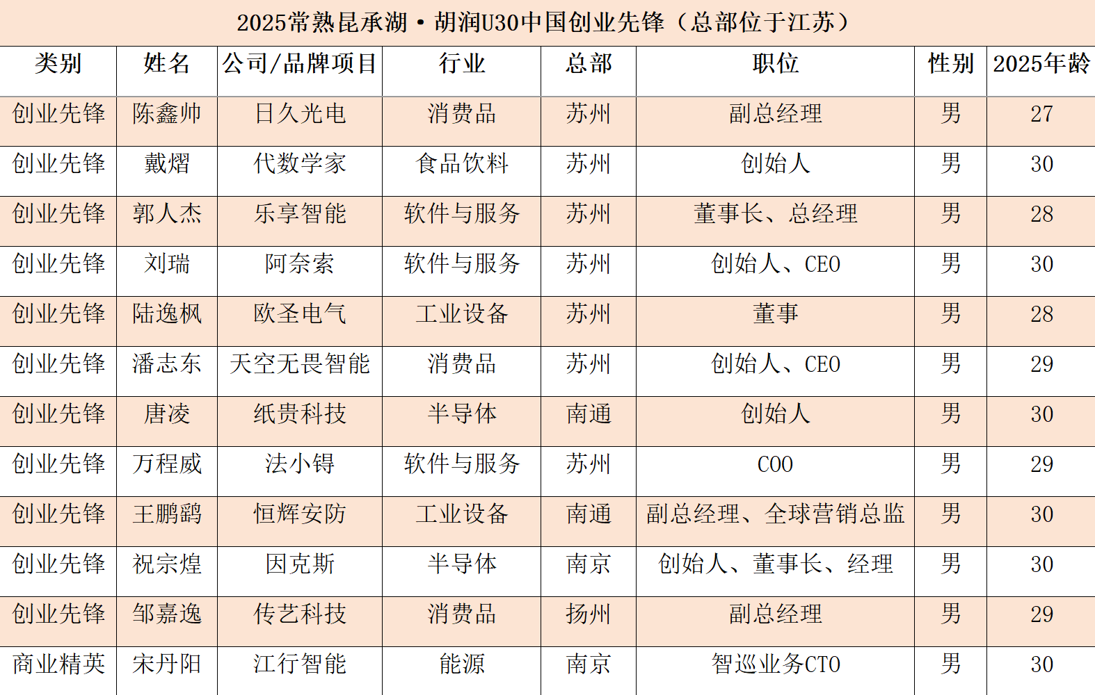 12名江苏年轻创业者上榜《胡润U30中国创业先锋》
