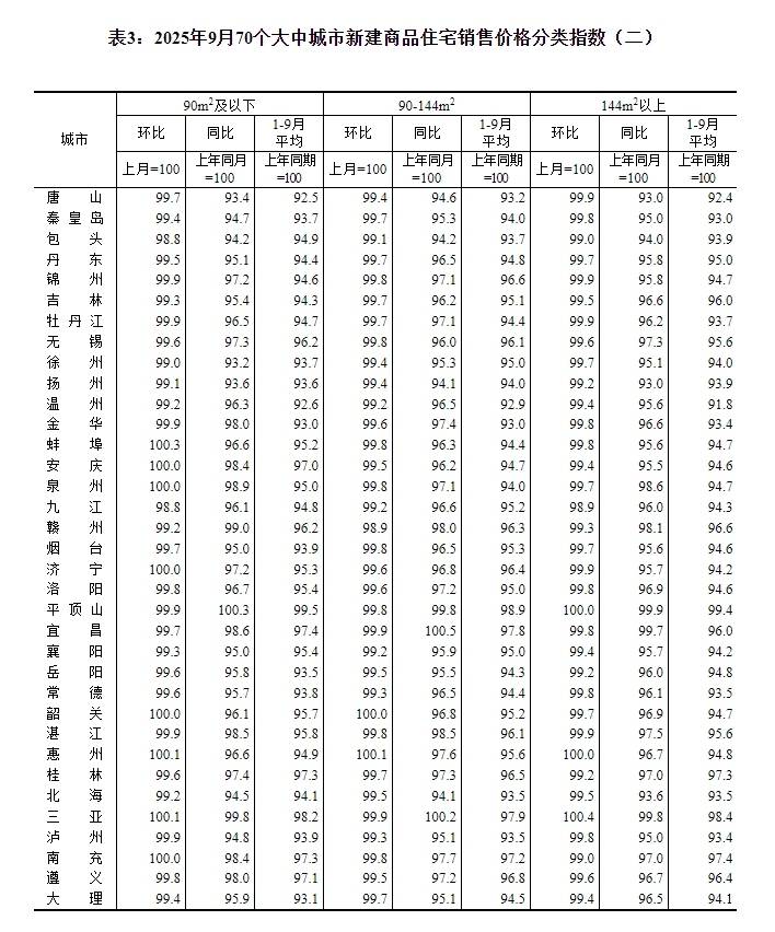 2025年9月份,70个大中城市中,各线城市商品住宅销售价格环比下降,同比降幅继续呈收窄态势。
