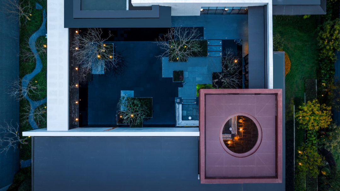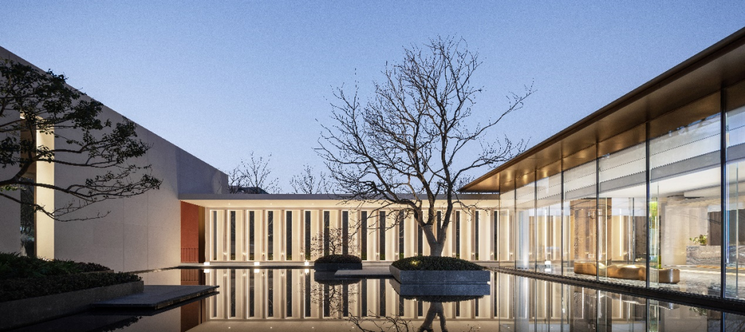 *水榭庭院,心境过渡:穿过府门,步入“光影回廊”,22根弧形柱廊如水波律动,与中央水景相映成趣。