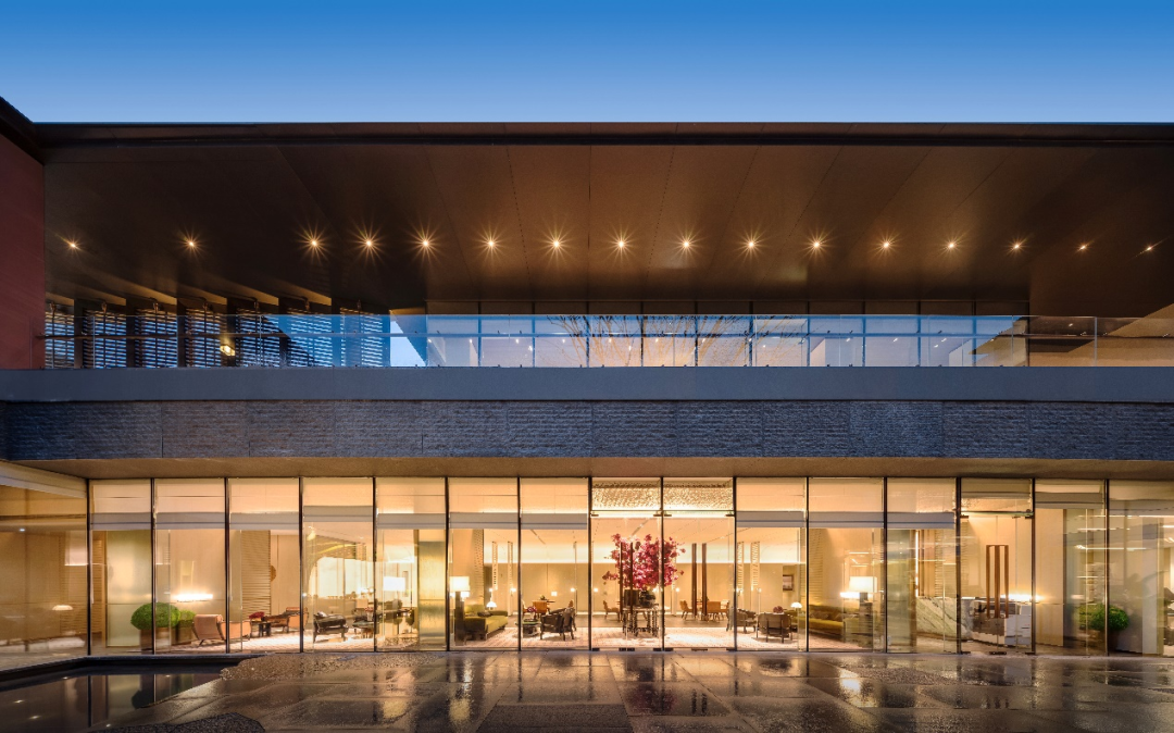 近40米的悬挑不锈钢雨棚、蕴含“欢迎八方来客”寓意的金属百叶,与源自巴基斯坦的红砂岩景墙、葡萄牙米黄石材共同构筑起恢弘大气的第一印象,彰显世家门风。