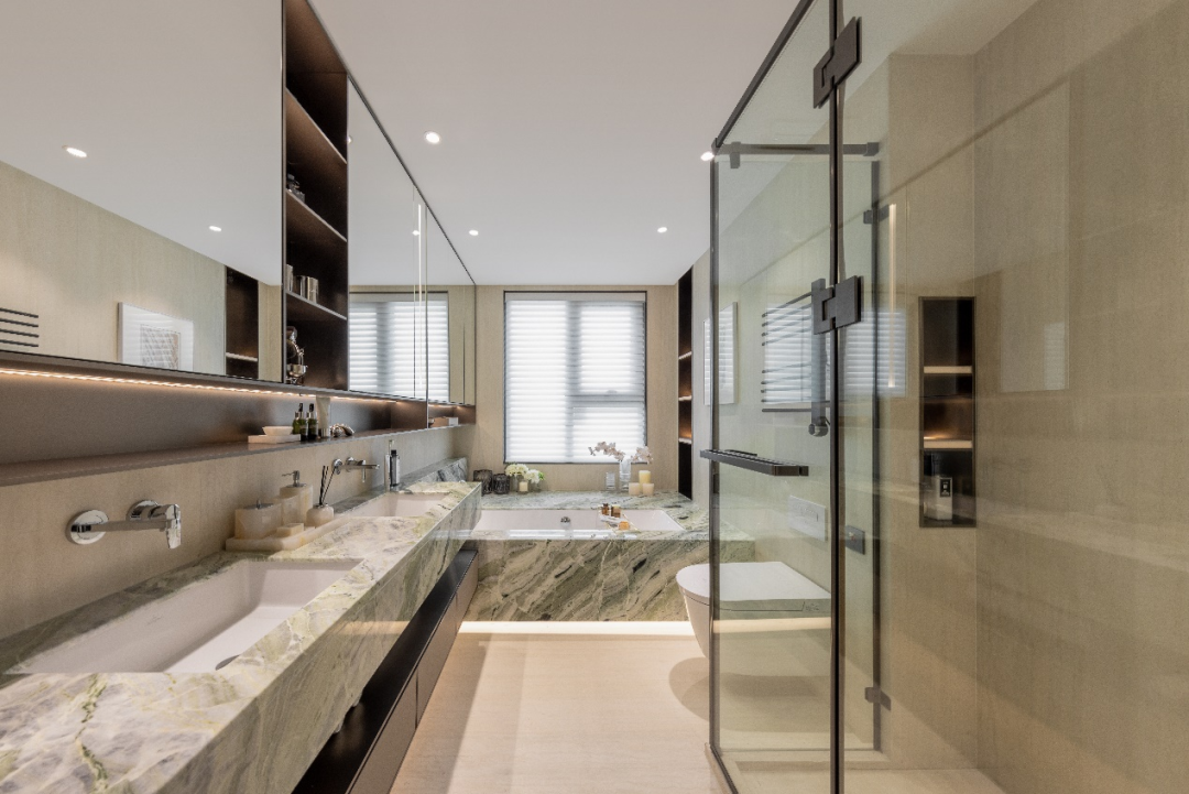 • 顶配精装与人性化考量:室内全线采用岩板铺装,其耐磨、零渗透、抗菌防滑的特性远超传统瓷砖。