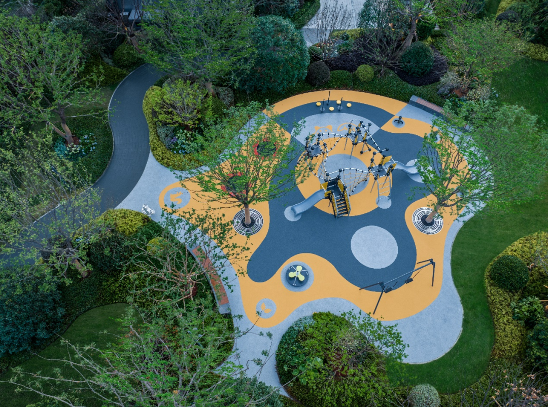 八大核心景观节点如珍珠般散落,无论是东地块的烟雨行廊、童梦乐园、户外轻bar、涟漪花园、阅读花园,还是西地块的迎宾流韵、林语会客厅,均以“四围一合”的合院式造景手法,打造步移景异、藏风聚气的沉浸式景观体验,让归家成为一场在自然中的漫步。