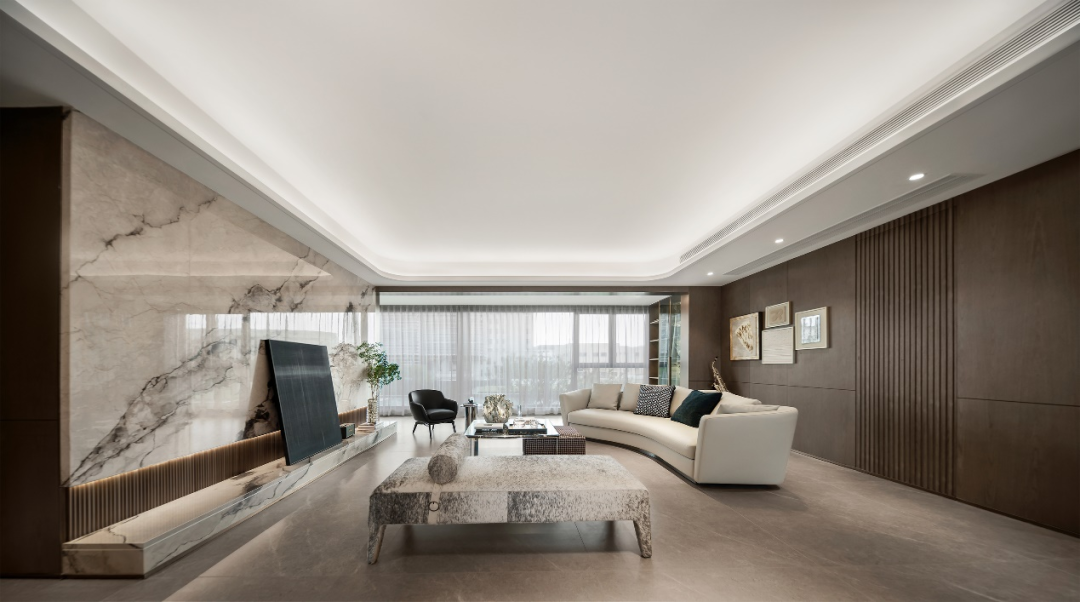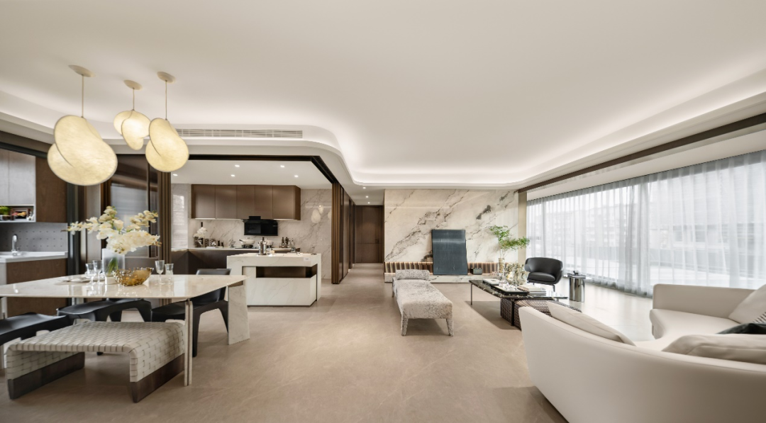 约6.1米的宽厅设计,搭配南向约9.3米的巨型宽景阳台,将室外约4.8万方的园林盛景最大化引入室内,光影流转,四季更迭皆成家中日常。