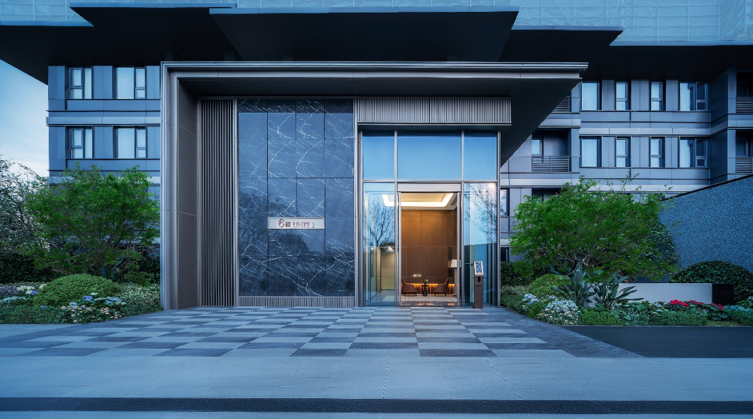 *酒店入户,尊崇自成:行至楼栋,酒店级入户大堂赫然呈现。大面积玻璃与星耀灰石材形成虚实对比,香槟金铝板与格栅在暖色灯光下熠熠生辉。