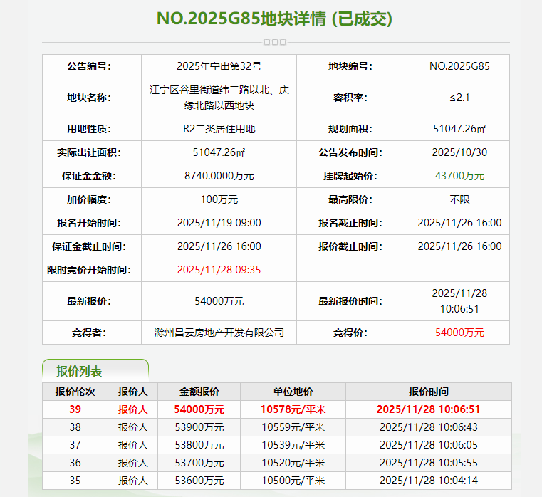 在当天举行的土拍中,总共推出了两幅住宅用地,分别位于浦口桥林和江宁谷里,用地面积超8万平方米,起拍总价为7.56亿元。结果,桥林G84地块被南京芯源房地产开发有限公司以底价3.19亿元拿下,楼面地价为6047元/㎡。该地块位于浦口桥林新城,紧邻2025年9月开学的公办南京一中浦口区桥林新城小学,周边生活气息较为成熟;地块北侧为今年4月成交的低密宅地G11地块,成交楼面价6086元/㎡,与之相比,基本相当。