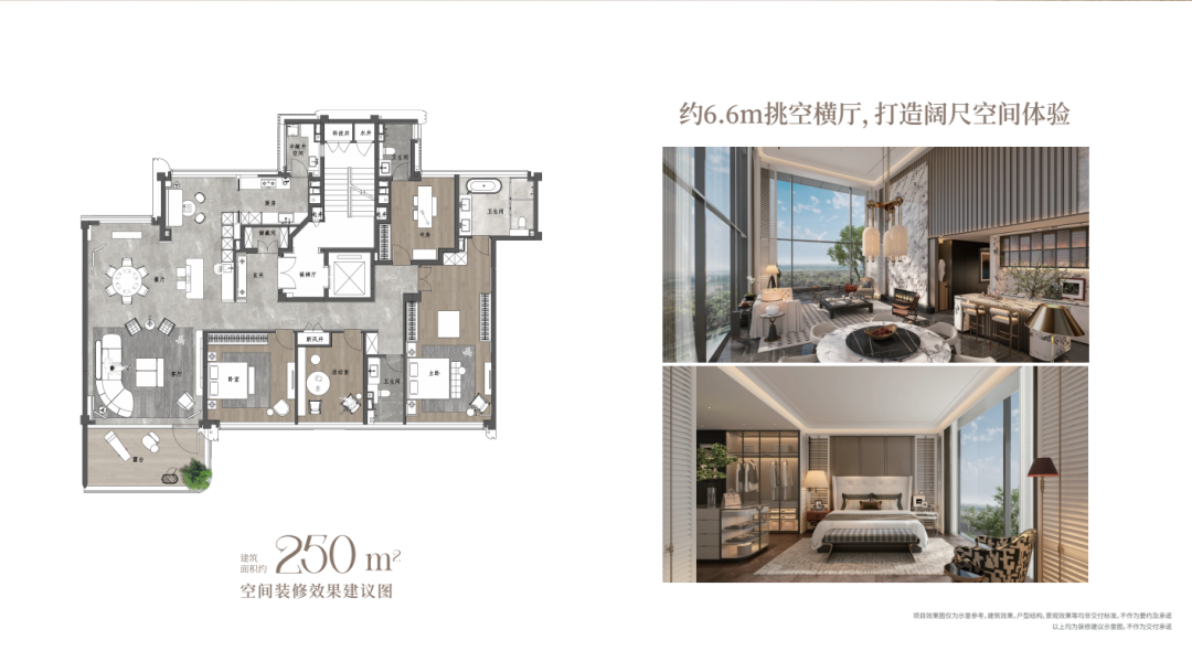 以约250㎡样板间为例,约6.6米挑高客厅、约20.3米南向大面宽,搭配宝格丽白大理石背景墙、进口墙布皮革等材质,营造出经典老钱风的恢弘气度。户户配备的错层挑空露台,打破了室内外的界限,将平墅的生活体验引入高层。