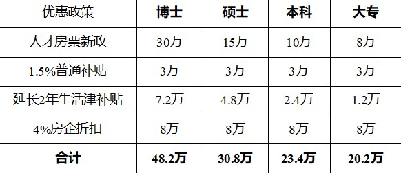 以人才购买200万新建商品住房为例,博士、硕士、本科、大专人才房票补贴金额分别为30万、15万、10万、8万。人才在2026年6月30日前购置新房,都能享受1.5%普通购房补贴(3万元);企业人才生活津补贴延长2年,博士、硕士、本科、大专分别可获生活津贴7.2万、4.8万、2.4万、1.2万。根据买卖双方在议定销售价格基础上可再享4%的专属折扣、最高不超过12万元的规则,人才凭人才房票可额外享受8万元购房折扣。以上三类相加,博士、硕士、本科、大专人才共计可获补贴分别为48.2万元、30.8万元、23.4万元、20.2万元。