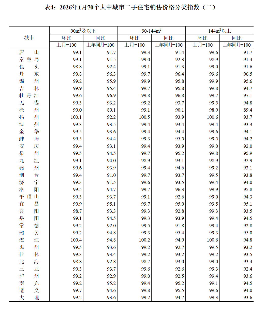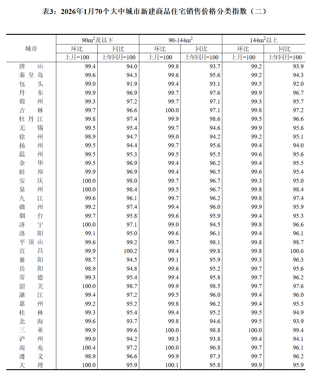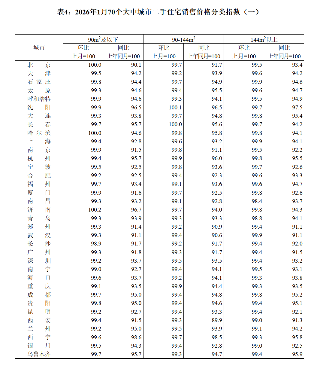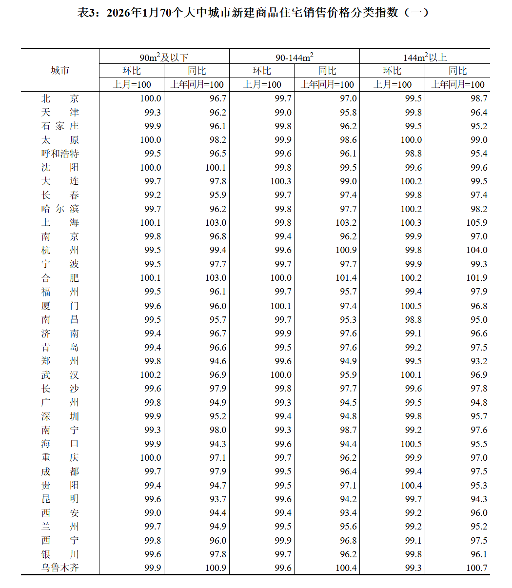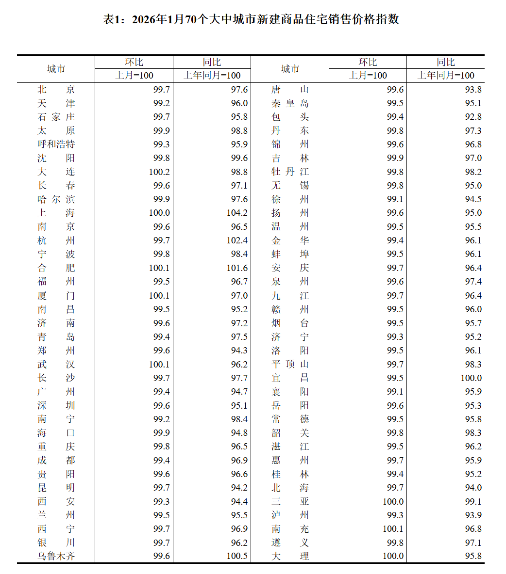 2026年1月份70个大中城市商品住宅销售价格变动情况