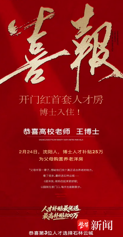 就南京房地产市场而言,扬子晚报/紫牛新闻记者注意到,春节假期后的首个工作日,南京已有一批楼盘晒出了成交喜报。如雨花板桥的石林云城发布喜报称,一位来自沈阳的王博士为父母购置了一套洋房,据了解,这是该楼盘迎来的第三位人才。据悉,今年春节前当地发布人才购房补贴新政,博士可获15万补贴,硕士11万、本科7万、专科3万,同时,购买新滨江片区(板桥、梅山、古雄、开发区)的房源还可额外再补贴10万元,因此这位购房人总共获得博士人才补贴25万。