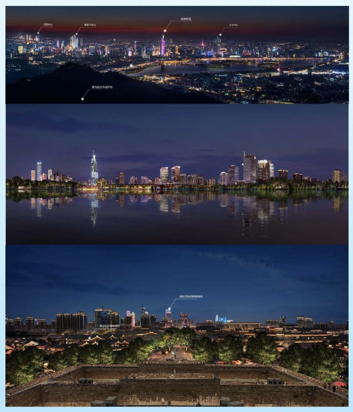 在布局结构上,此次规划提出南京城市夜景照明总体架构为“一带、一环、三轴、五核、多点/线”,“一带”是指长江滨江夜景带;“一环”是指明城墙文脉夜景环;“三轴”是指三条历史轴线;“五核”是指新街口中心照明核、江北中心照明核、河西中心照明核、城南中心照明核、夫子庙/秦淮河照明核;“多点/线”是指其他对夜间经济、文旅发展、城市形象有促进作用的重要区域。