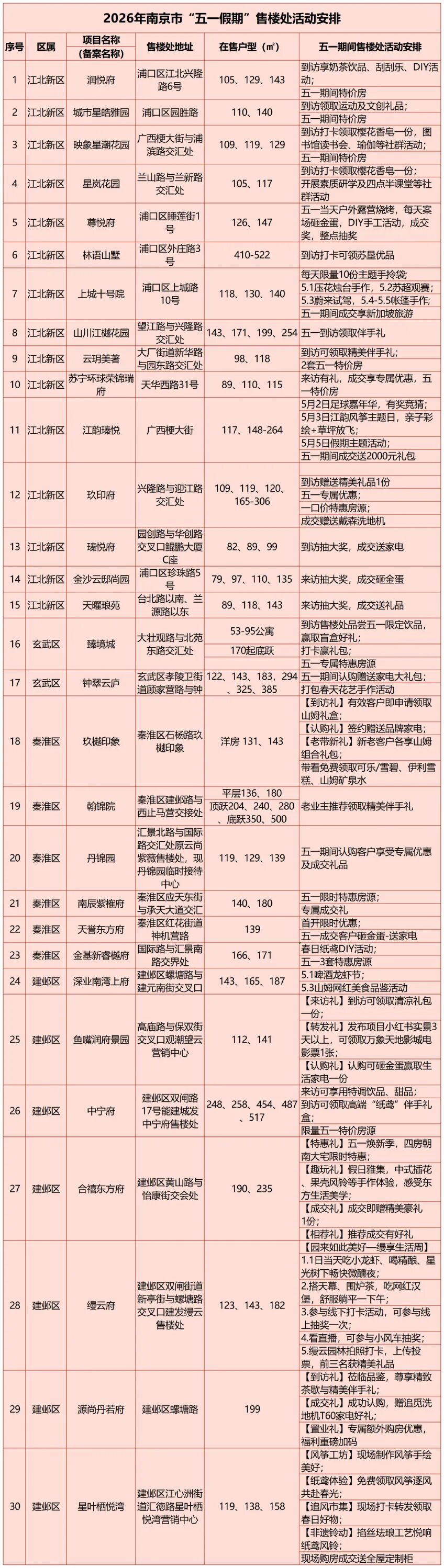 针对五一假期,记者了解到,江宁区房产部门将推出“S2地铁赋能滨江・五一安居惠民焕新”房产展销活动,集中展示板块地铁宜居价值与高性价比置业优势,并推出多重购房优惠与民生福利,满足S2宁马地铁全线通车、假期消费、都市圈外溢三重消费需求。江北新区将开展人才房票政策宣传、优质房源推介等活动,助力各类人才轻松安家、舒心置业。