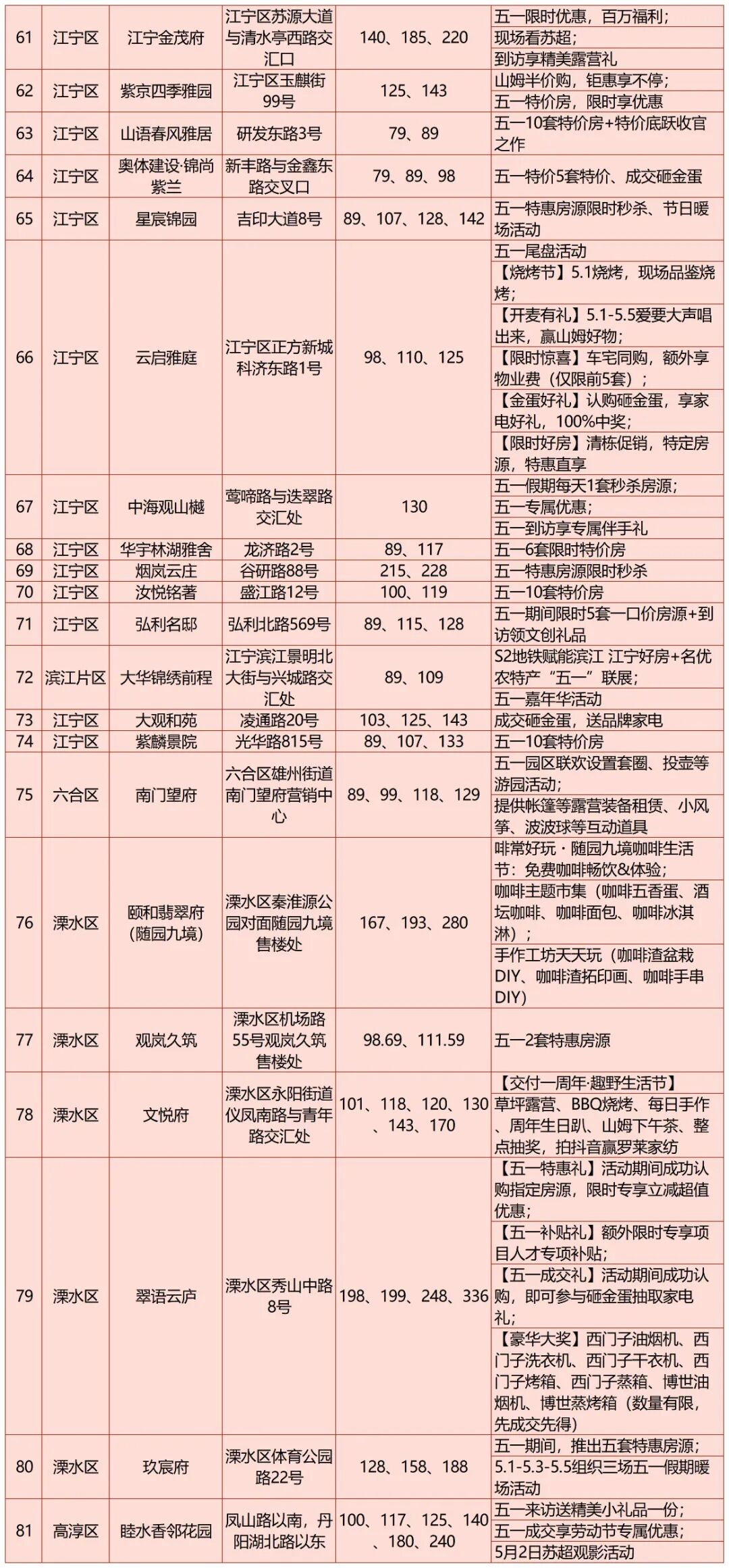 扬子晚报网4月30日讯(记者 马祚波)针对即将到来的五一小长假,南京江宁、江北多地将推出房产展销、假期特惠等一系列优惠举措,为购房者提供优质服务。此外,全市主要在售的81家楼盘也将推出限量特惠房源、专属优惠等活动,满足刚性和改善性住房需求。