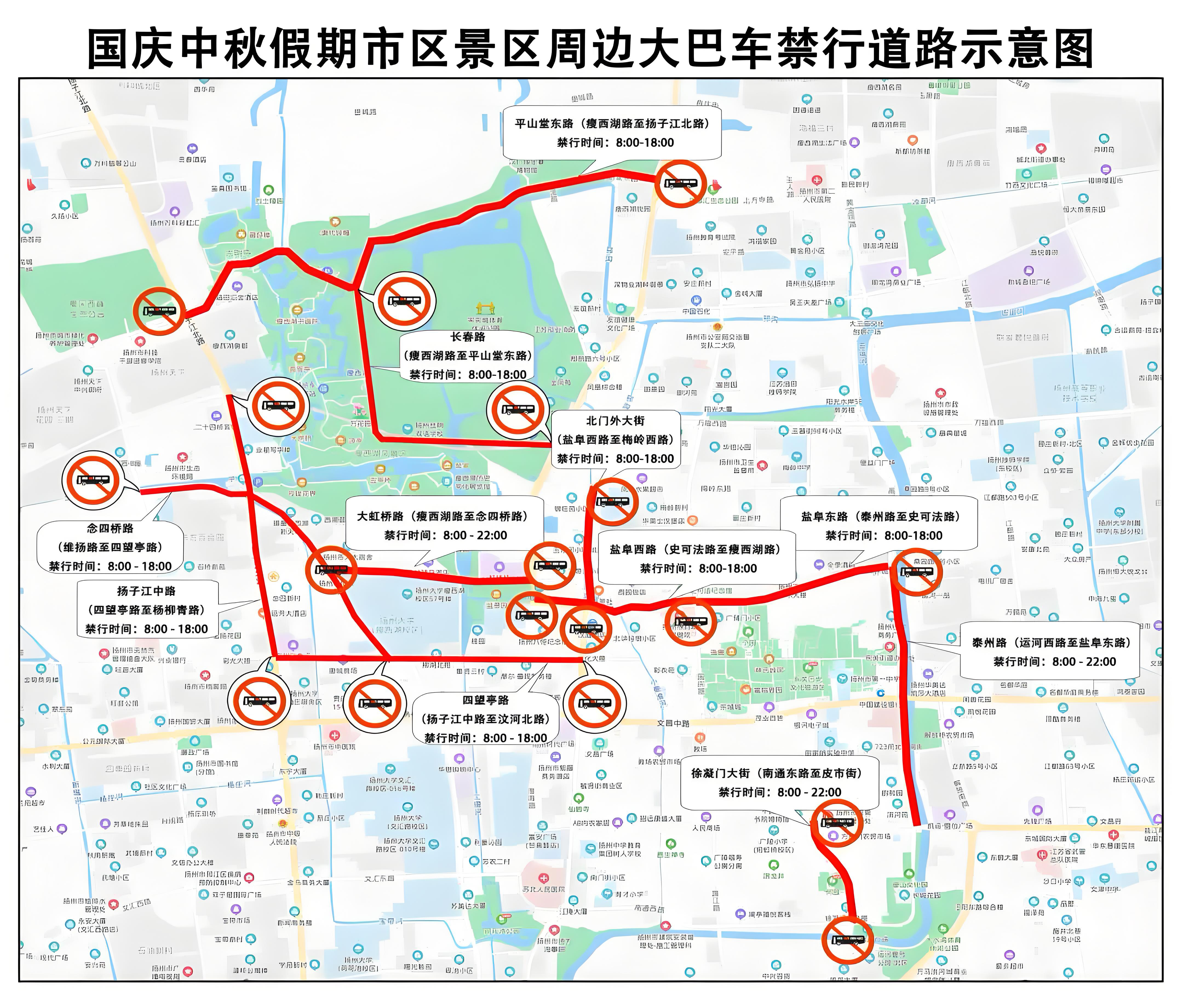 12、扬子江北路(四望亭路至杨柳青路)、念四桥路(维扬路至四望亭路)、北门外大街(盐阜西路至梅岭西路)、盐阜西路(史可法路至瘦西湖路)、盐阜东路(史可法路至泰州路)、平山堂东路(瘦西湖路至扬子江北路)、四望亭路(扬子江中路至汶河北路)、长春路(瘦西湖路至平山堂东路):8:00-18:00,禁止旅游大巴驶入;泰州路(运河西路至盐阜东路)、大虹桥路(瘦西湖路至念四桥路)、徐凝门大街(南通东路至皮市街):8:00-22:00,禁止旅游大巴驶入。
