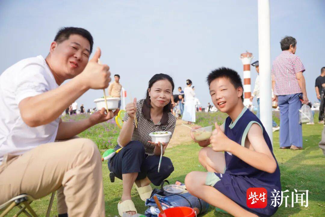 从线上票选中脱颖而出的十家人气店家(按自愿参与原则)齐聚沙滩,参与现场制面环节。香气弥漫中,众多游客加入品尝与投票,摊位前排起长龙,气氛热烈。最终,“湘府湘诚餐饮店”凭借其独具风味的招牌面条摘得桂冠,通州湾示范区党工委委员、政法委书记李培为其颁发荣誉奖牌,将现场氛围推向高潮。