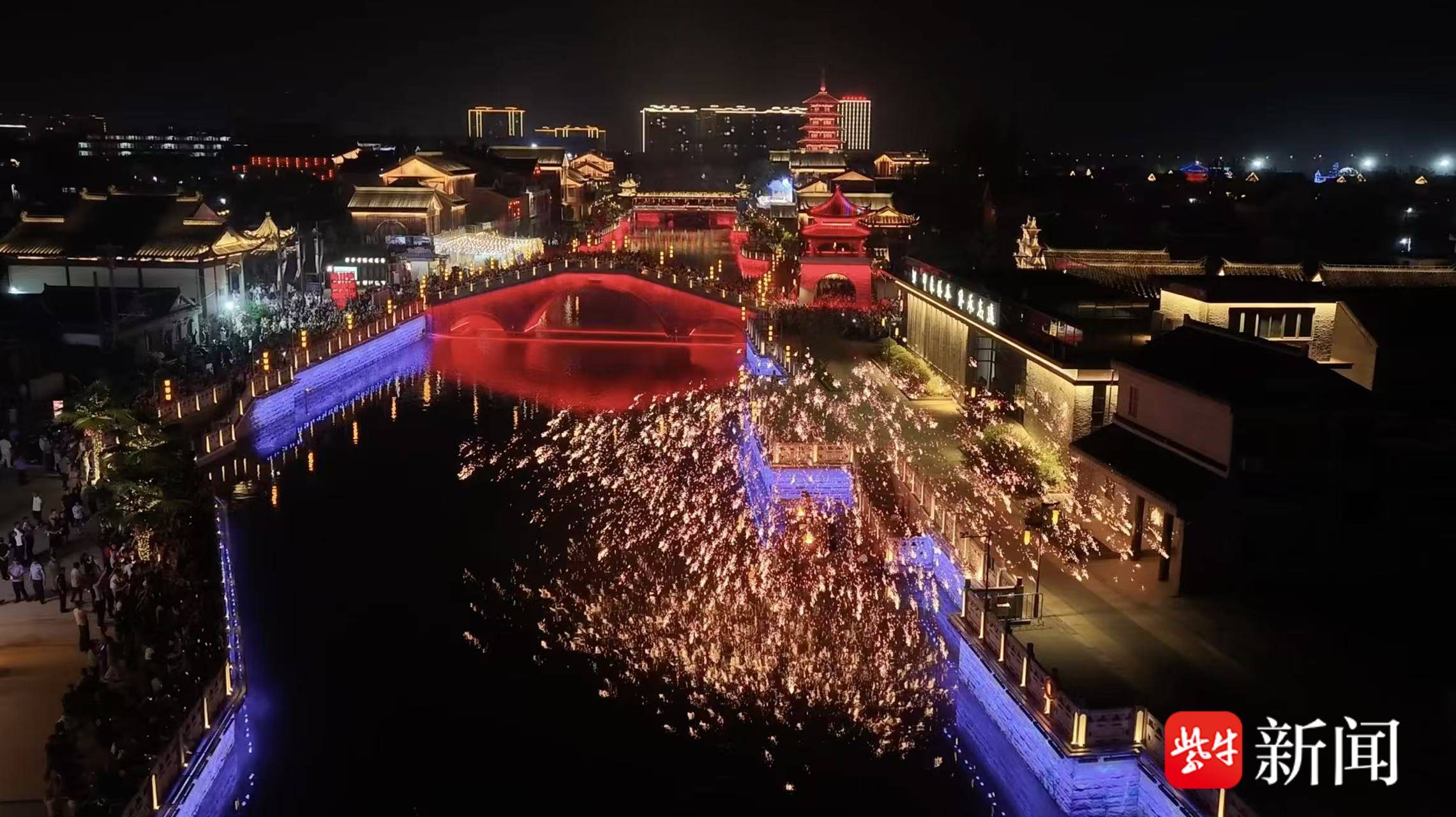 夜幕降临后的古镇更显浪漫与震撼。栟河之上,非遗“打铁花风火轮”表演惊艳亮相,高温铁花在夜空绽放,引得游客纷纷驻足。画舫游灯“御船曼舞秀”缓缓驶过,仿佛将游客带入千年之前的诗意江南。东莱阁前,《花好月圆》杂技专场演出更是将节日气氛推向高潮。游客穿梭在灯火璀璨的街巷中,感受着古镇独有的夜间烟火气。“每次回来我都能感受到古镇的变化,它在一步一步的在往纵深发展,既有朝气又有人文深度。”旅美画家丛志远感慨道。