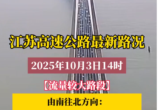 【江苏高速】省交通综合执法局:10月3日14:00,目前,全省高速公路总体运行平稳,通行秩序良好。受假期出行影响,部分路段车流量较大,有阶段性车多缓行情况。