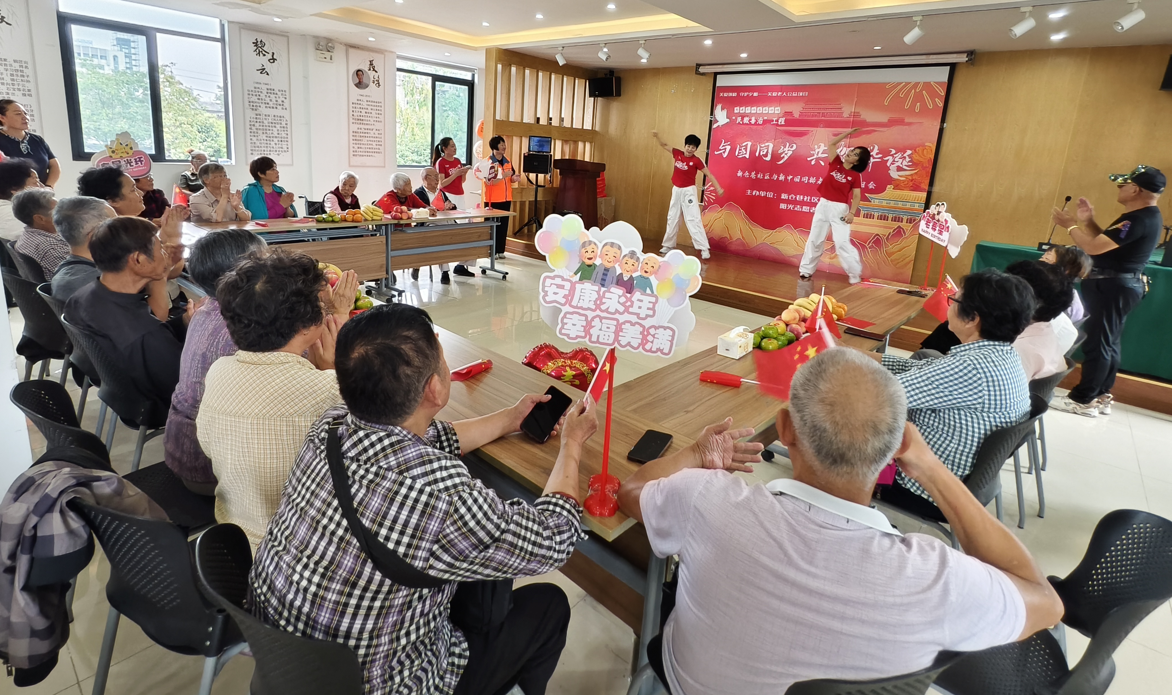 记者了解到,活动特别邀请了社区内多位1949年出生、与共和国同龄的长者欢聚一堂,共赏文艺表演,同享生日蛋糕,共话岁月情深。为将活动准备得温馨喜庆,志愿者与工作人员早早抵达现场,精心布置场地,准备茶点水果。“我们的这个活动早就谋划了,不仅仅是对祖国母亲生日的祝福,也是对社区这群为共和国成长做出贡献老人的致敬。准备得充分一点,我们辛苦一点,感到特别充实。”一位阳光志愿者对记者说。
