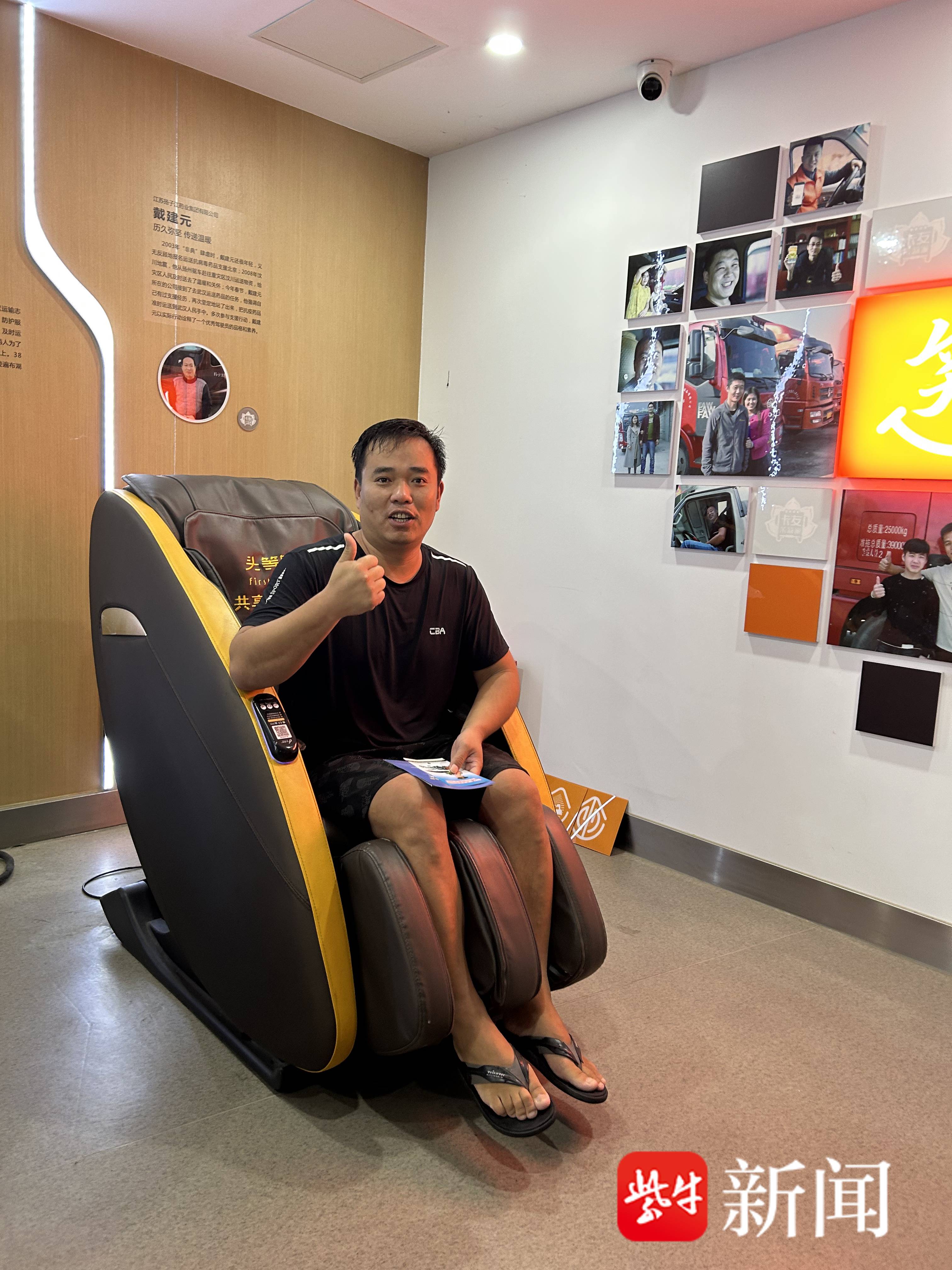 记者来到休息区,这里不仅有自动按摩椅,还有沙发休息区。河北籍货车司机张京华告诉记者,他运送一批演出道具到上海,途经这里休息一下。“这里的司机之家是我见过最好的司机之家,里面的基础服务都是免费的,宽敞干净,对于我们开货车常年奔波,需要找地方洗澡,特别是夏天,这里真有家的温馨感!”张京华躺在按摩椅上竖起大拇指。