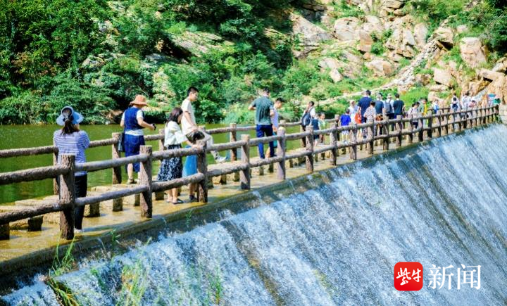最后走到龙潭涧的源头大坝——“龙池”,瀑布群的旅程才算圆满收尾。这里的水流放缓了脚步,沿着坝体缓缓流淌,倒映着远处的青山和绿植,格外宁静。