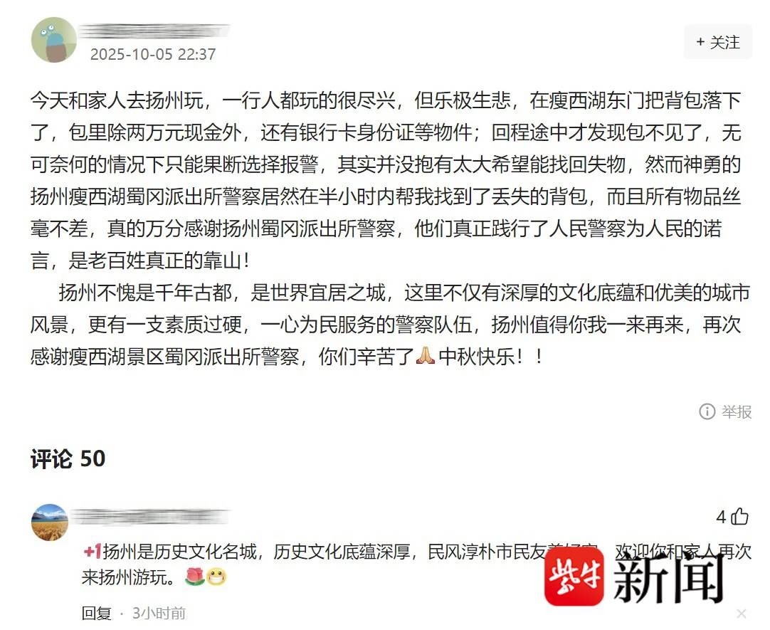 “扬州值得你我一来再来”,旅游警察热心相助,外地游客发文点赞