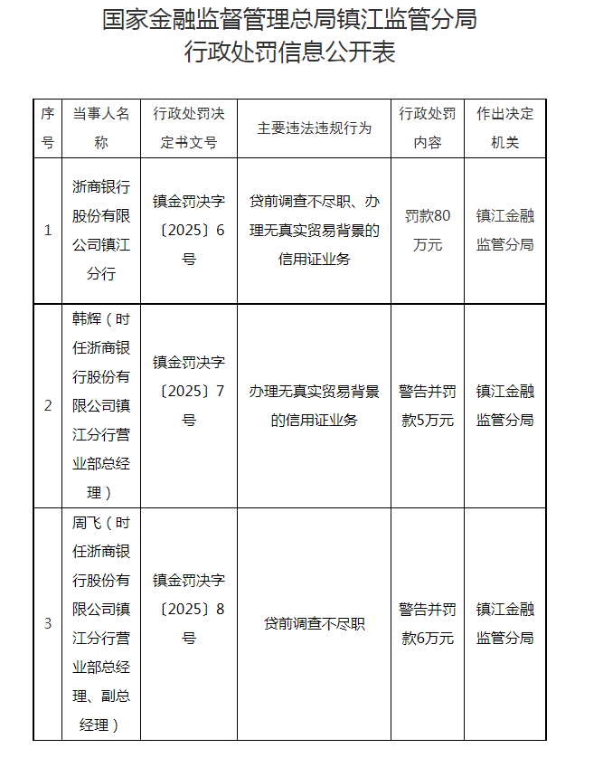 在“国家金融监督管理总局镇江监管分局行政处罚信息公开表”中,扬子晚报/紫牛新闻记者看到,浙商银行股份有限公司镇江分行的处罚信息为“镇金罚决字〔2025〕6号”,其主要违法违规行为为“贷前调查不尽职、办理无真实贸易背景的信用证业务”。镇江金融监管分局对其作出“罚款80万元”的行政处罚。