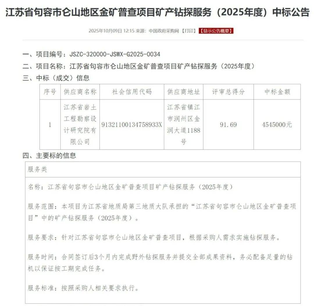 10月9日,中国政府采购网发布江苏省句容市仑山地区金矿普查项目矿产钻探服务(2025年度)中标公告。公告内容显示,中标人需在合同签订后3个月内完成野外钻探服务并提交全部成果资料。仑山地区金矿普查项目新一轮矿产钻探即将启动!