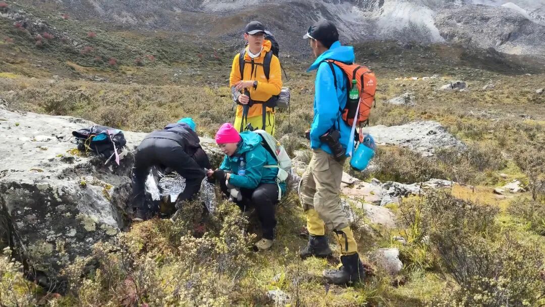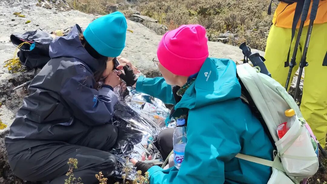 当唐子晨搀扶着女驴友走到相对平缓的区域时,幸运地遇到了一支徒步队伍,并且恰好其中有两名医护人员。大家迅速分工协作,裹保温急救毯、掐人中、提供便携氧气瓶、联系救援,最终女驴友被顺利转移至安全地带,并得到及时救治。
