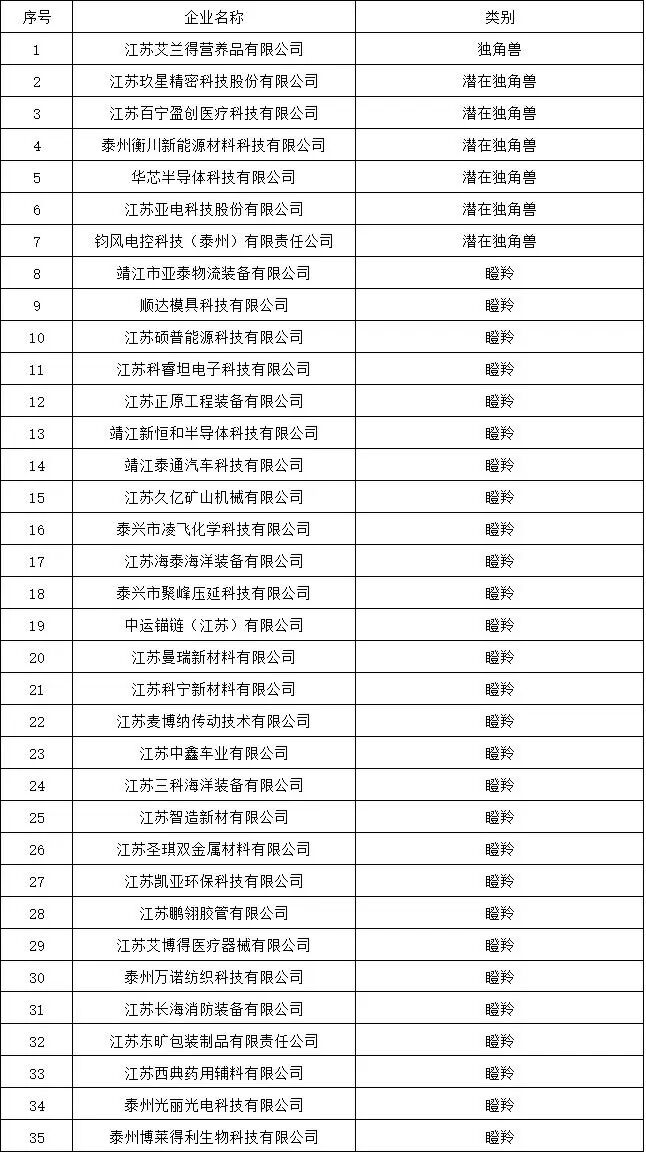 此次榜单中,江苏艾兰得营养品有限公司获评2025年独角兽企业;江苏玖星精密科技股份有限公司、江苏百宁盈创医疗科技有限公司、泰州衡川新能源材料科技有限公司、华芯半导体科技有限公司、江苏亚电科技股份、钧风电控科技(泰州)有限责任公司获评2025年潜在独角兽企业;泰州博莱得利生物科技有限公司、江苏圣琪双金属材料有限公司等28家企业获评2025年瞪羚企业。